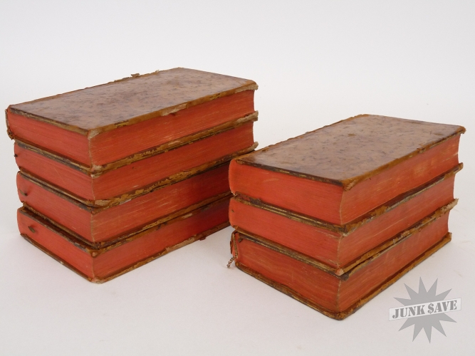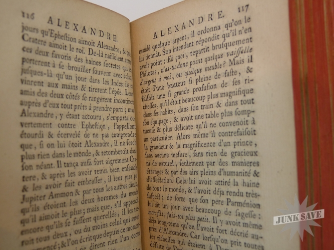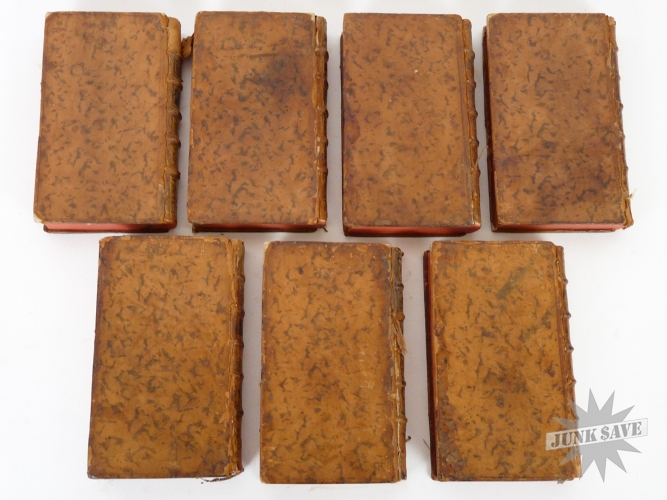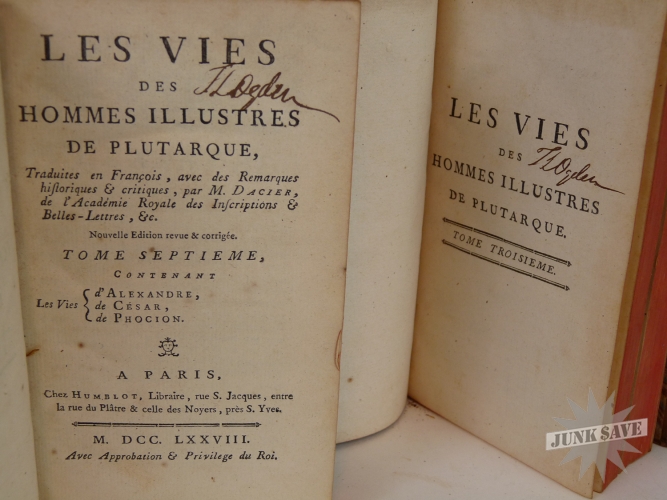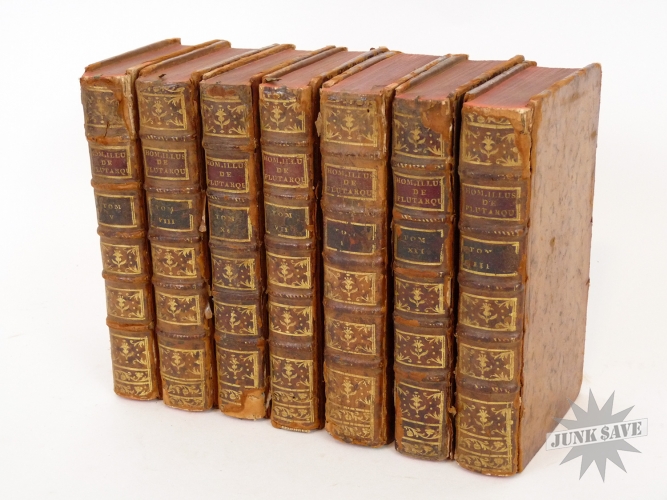 Set of leather bound books from 1778, offering an incomplete set of 7 volumes in French, Plutarch Aux Vies des Hommes Illustres aka Plutarch's Lives which is a famous book about the Greeks and Romans, published in Paris. Volumes 1, 3, 5, 7, 8, 11, 12. The condition is good but not great, no water damage, binding good, the spine and covers are falling apart with little flakes and chips coming off when handled, but no loose or missing pages, no writing inside except each one has the name Ogden carefully signed in ink on the title and copyright pages. On the plus side much of the gold gilt is still present, with calf leather marbled, and a wonderful old book smell, would look great on a shelf and are readable if you know French! Probably a solid G grade however we are not experts on book grading so please ask questions if you need.