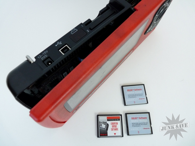 Set of 2 Solus automobile scanners by Snap-On Tools. These are model EESC310, here are 2 units with rubber grip caps and stands, and each have 2 software cartridges plugged in the top as shown (4 total cartridges). These do not come with any plugs or adapters. One unit looks like it may have already been opened up for repair, while the other unit looks to be more intact. One unit looks a little cleaner than the other, obviously both have been used to some extent and have dirt and auto-shop handling wear. These scanners are handheld computers with LCD screens that run the Windows CE operating system, the screens look to be in good condition but haven't been tested. We are unable to test anything on these and are being sold for parts and repair - no returns.