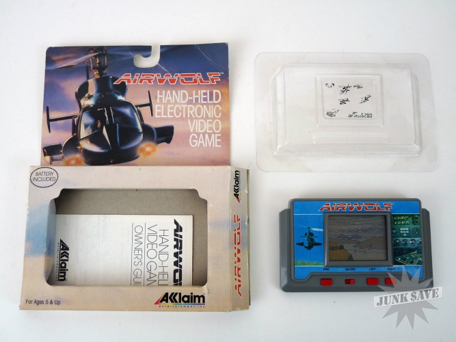Very rare to find still in box, Airwolf handheld LCD video game by Acclaim circa 1988. Game tested and working, except couldn't get any sound, might be a setting or an easy repair. Game has only been played a few times, the box was opened carefully on the side, otherwise box is nice. Complete and mint game.