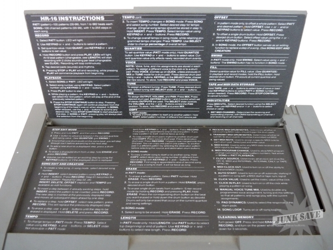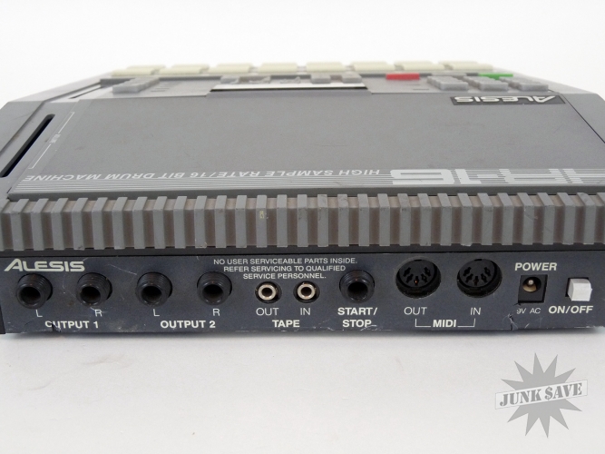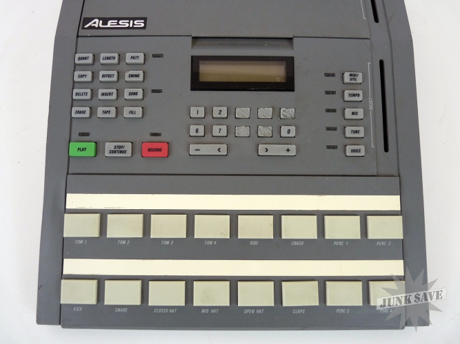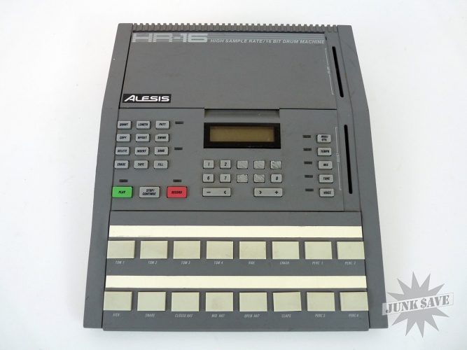 Old electronic drum machine by Alesis, model HR-16 High Sample Rate 16-bit. It is missing some buttons on the numeric keypad, and the sliders are missing their handles. The worst damage is that on the underside in one corner, the metal has bent or melted a few inches (see photo). There is no power cord, this is untested and being sold for parts and repair.
