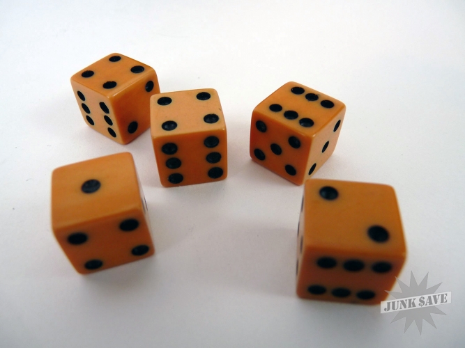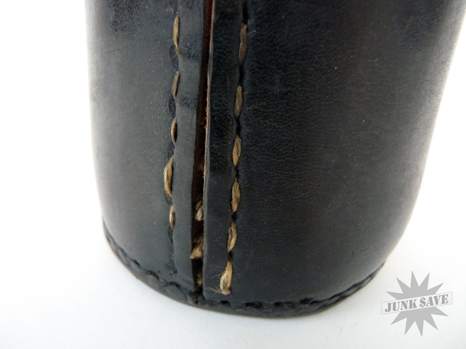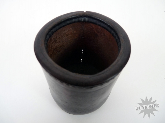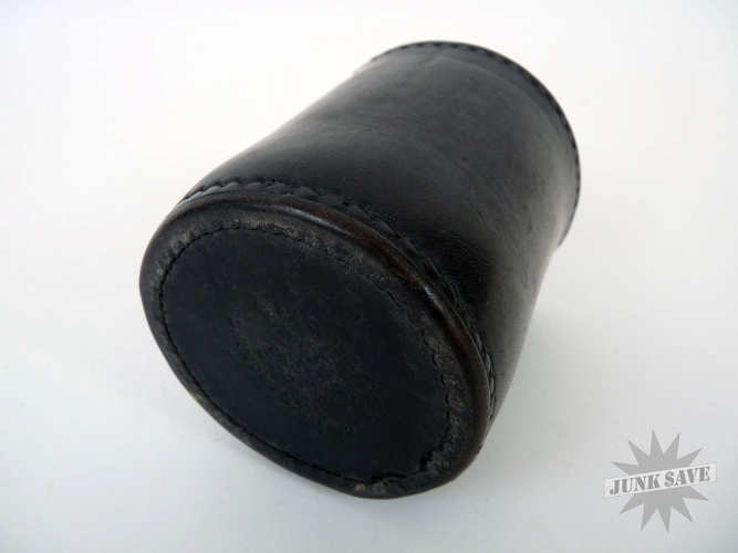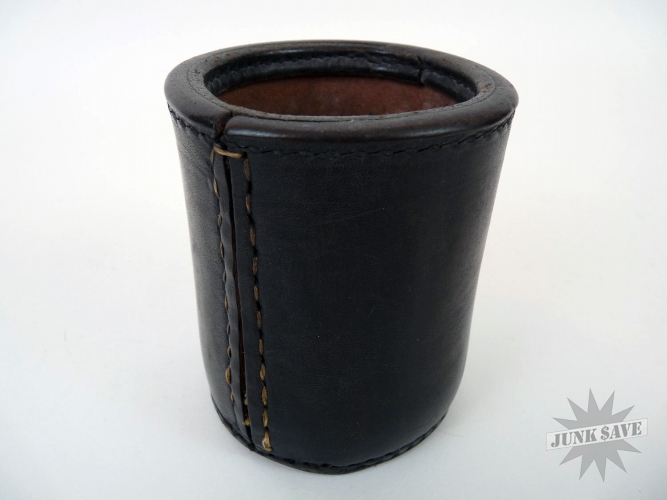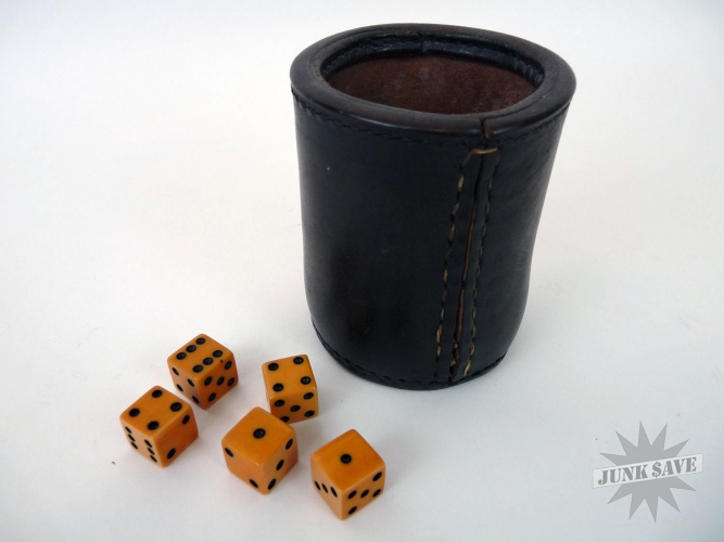 This is a great looking vintage dice rolling cup, hard to guess the exact age but likely 1920-1930s. Thick leather, very sturdy, cool lacing. The lacing has started to come loose near the bottom, but seam and lacing still tight, looks and feels like it has been this way for decades. The cup was used but not heavily, has honest wear. Bottom shows "Moose Brand" by Brauer Brothers of St. Loius, who is known for their high quality leather gun holsters. Comes with 5 antique bakelite dice, all of which have similar color and appearance.
