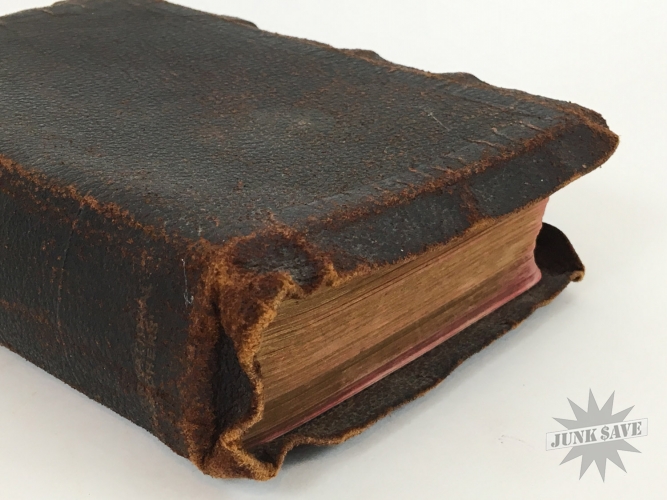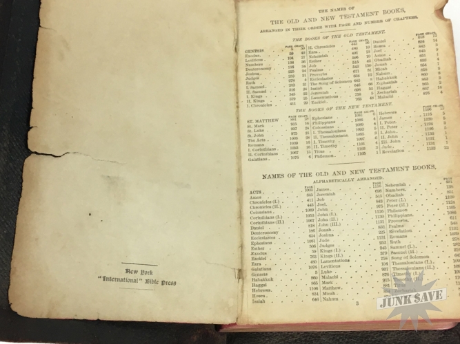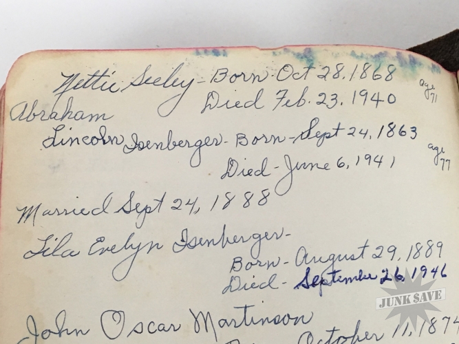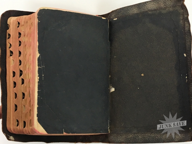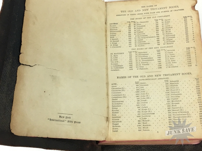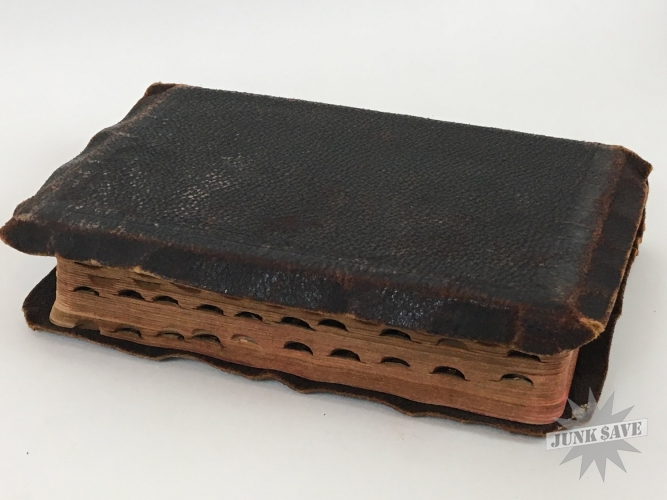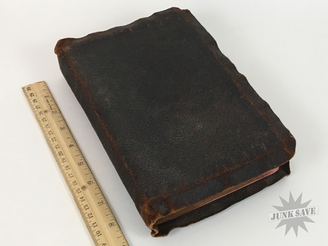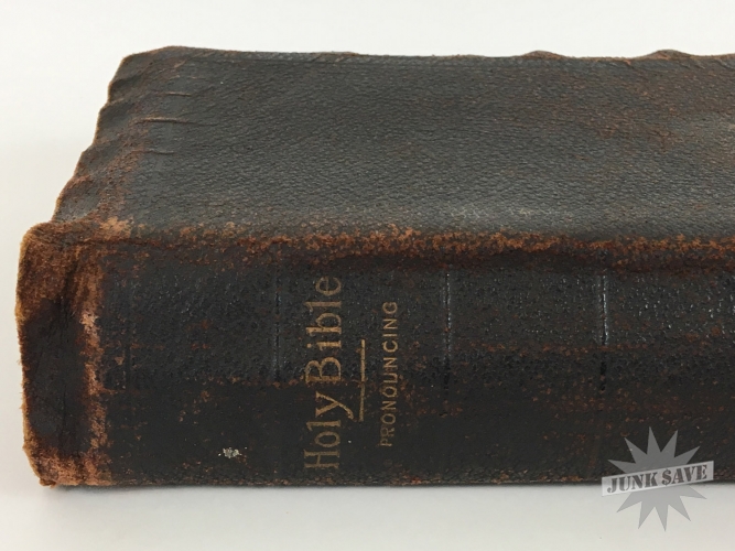 International "Pronouncing" bible in English from the late 1890s, encased in leather, back contains some family history from surnames such as Isenberger, Seeley, Martinson, Harding, and Gillette. One of the early family entries which is verifiable through online ancestry databases (and found a photo of his gravestone) is for "Abraham Lincoln Isenberger born Sept 24 1863" pretty cool antebellum name! Another name is "Nettie Seeley born 1868" (Nettie Emerson Seeley), found a portrait online of her and Abraham together. Family seems to be from the Midwest, Illinois, Iowa, Minnesota, and some later moved west to California, Oregon, Washington. Bible is in good condition, inside front cover is missing but is still affixed to outer leather. Binding a little loose but still good. Leather has some normal surface wear for its age. A few of the front/back pages have some tears and a set of pages in the front have some wear around the chapter locator divot near edge.