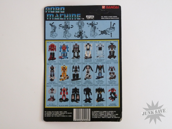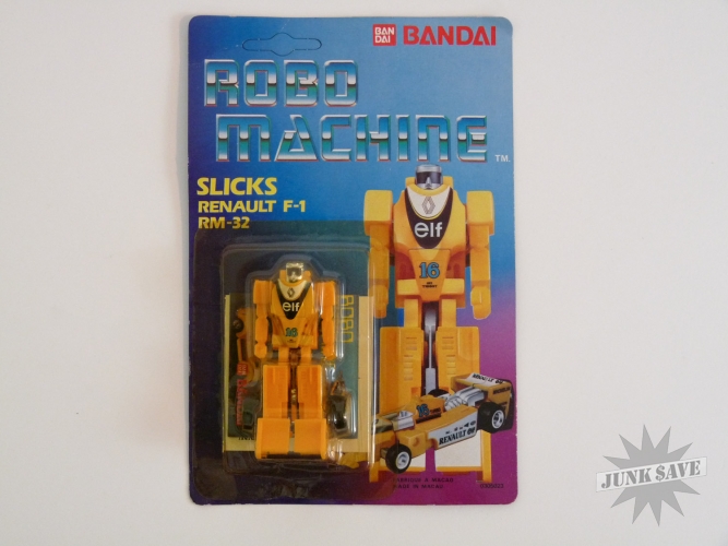 Vintage 1980s Bandai Robo Machine transforming gobot robot toy action figure. RM-32 Renault F-1 "Slicks". New and still sealed on unpunched blister card. Package very slightly warped from storage, with some minor edge and corner bumps wear. This is a rare European version, new old dealer stock. Only 1 available.