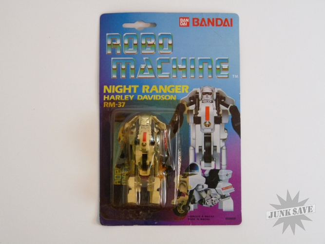 Vintage 1980s Bandai Robo Machine transforming gobot robot toy action figure. RM-37 Harley Davidson "Night Ranger". New and still sealed on blister card. Package very slightly warped from storage, with some edge and corner bumps wear. This is a rare European version, new old dealer stock. Only 1 available.