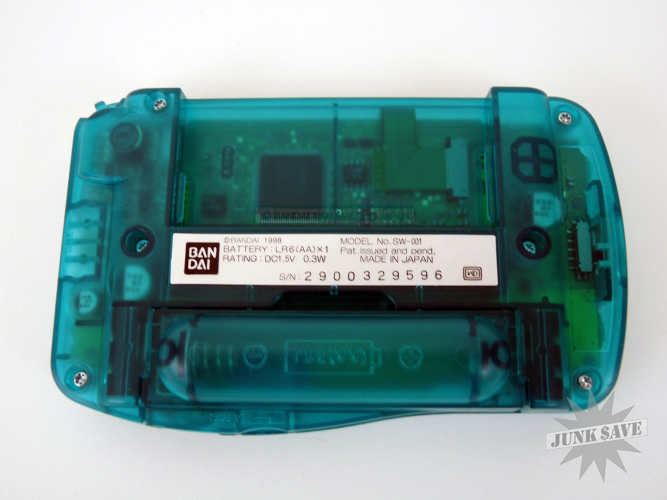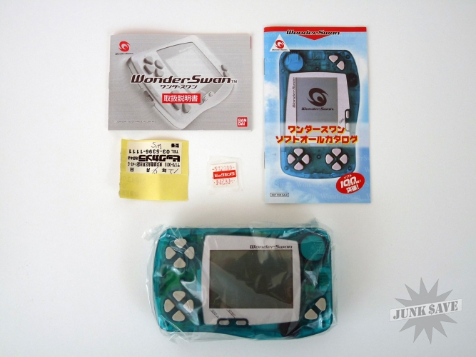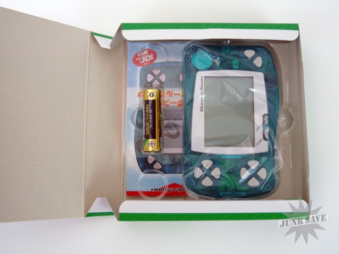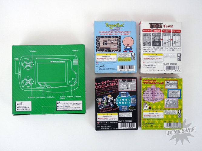 Bandai WonderSwan system like new in original box with 4 boxed game cartridges. The body color is called "Skeleton Green". This is the early black & white screen version of the WonderSwan, a high quality system and in my opinion always an underrated gaming platform which was made by the awesome Gunpei Yokoi who also designed the early Nintendo Game & Watch series. The game has been used, but only barely so this is in nearly new and working condition. The games are Engacho (very crazy!), Street Dancer, Gunpey (puzzle game named after Gunpei), and Dokodemo Hamster. Keep in mind that some of these games have instructions in Japanese and could be difficult to understand, but most are straightforward enough and use English during the game.
