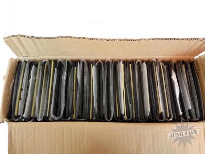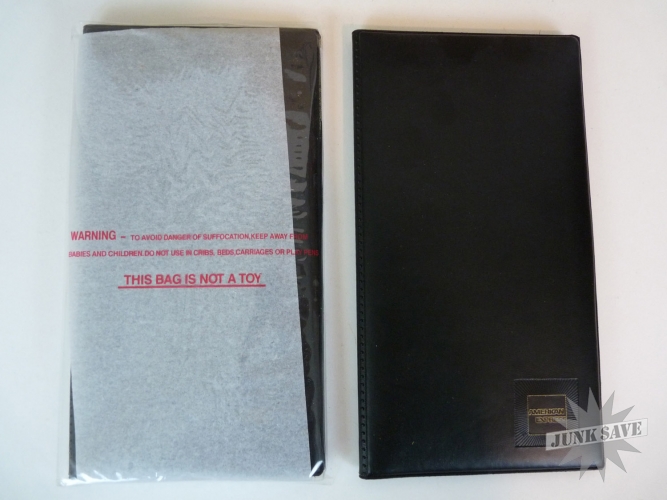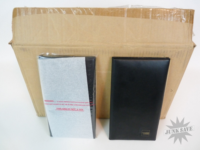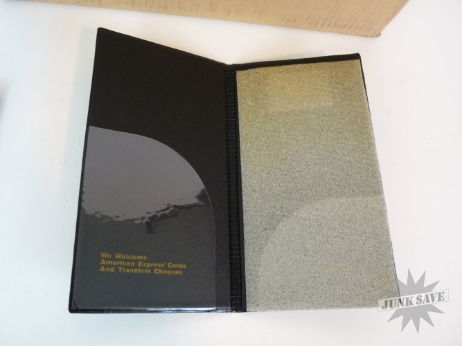 Case of 25 new black credit card holders for restaurants. Holders have American Express logo on the bottom front and "We Welcome American Express Cards and Travelers Cheques" on the inside. These are the standard size holders with clear plastic sleeves to hold receipt and card. The outer box has some wear but all the holders inside are unused and new as shown in photos.