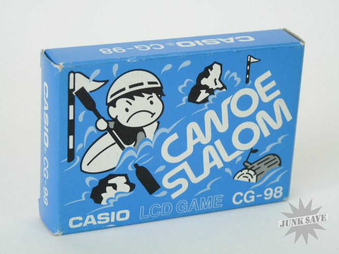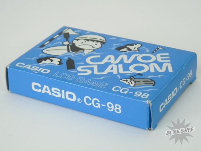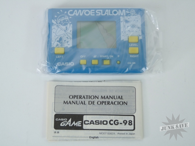 Casio CG-98 "Canoe Slalom" LCD handheld video game from the 1980s - new old stock, complete, and has never been played. Because it is brand new we did not want to open the screw on the back of game to replace the battery for testing. We will leave opening the game or testing it up to you. Keep in mind on these small Casio games the plastic is old and fragile, and the speaker wire is attached to the back when opened - if you attempt to open the game and damage the item in any way it cannot be returned. We are selling this is as a rare, unused vintage collectible. We have a few in stock and all are identical mint and new, no price stickers, no damage or wear to boxes.