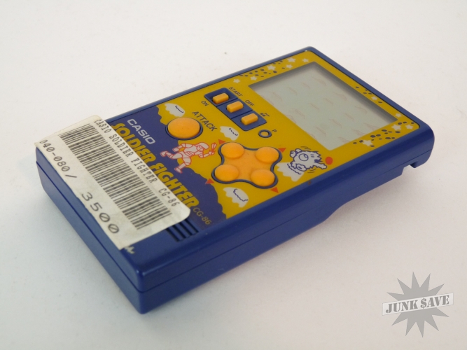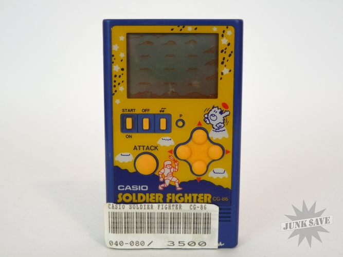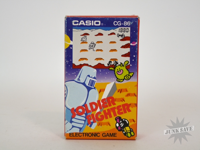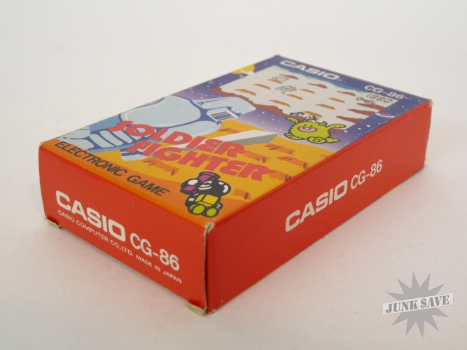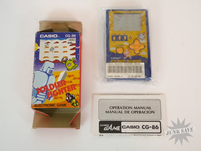 Vintage Casio electronic game Soldier Fighter model CG-86. Minty condition in original box with original bag and instructions, appears to have been only played a few times. There is an old price sticker on the bottom front of game, we didn't try to remove it and could easily be cleaned off if desired but will leave that up to you. Tested and screen, sound, controls are all good. Still has the original batteries, which are of course dead and new batteries are required. Box also in amazing condition, a rare Casio game!