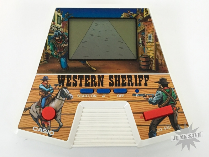 Rare to find new old stock store Casio Western Sheriff vintage 1980s LCD handheld electronic game. Never played except for testing, screen is bright sounds loud controls great. Sound effects amazing on this one!With a very nice condition box and baggie and instructions and 2 inner cardboard holders - and even comes with an original set of Casio AA batteries (long dead). Box has a tiny ding/rip in one top corner, see photo. A classic Casio in beautiful condition for your collection.
