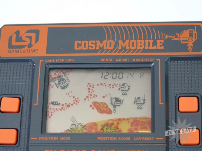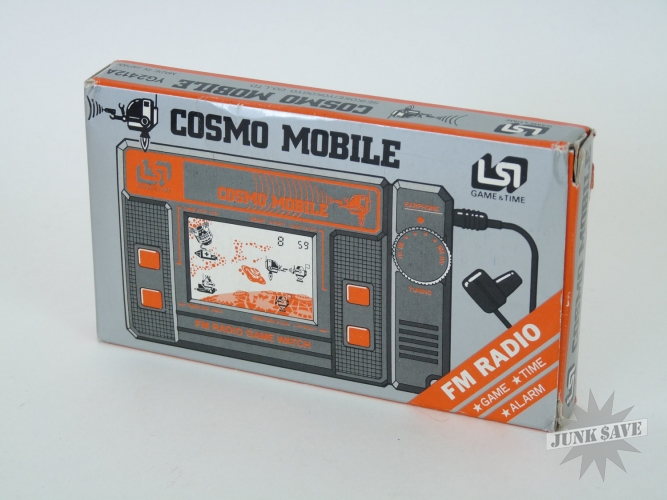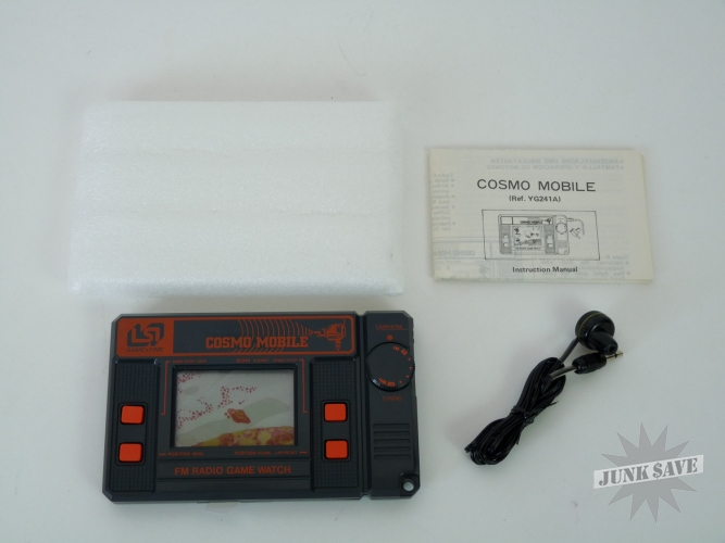 Mint in box vintage LSI "Game & Time" like a Game & Watch handheld game, this one entitled Cosmo Mobile. Also works as a radio, and this is one of the more difficult to find game/watch/radio all-in-one gadgets from the 1980s. Unused game, has foam bag holder, instructions, and unused earphone, even the white battery protector tab is still in place. Game tested and working good. Tried to test FM radio which uses a separate battery compartment, but the three original UM-5 batteries are dead so unable to test radio. Box has some light wear from storage, some of the smaller end flaps are ripped and getting loose, which is something we've seen happen with games that used foam bags instead of styrofoam holders.