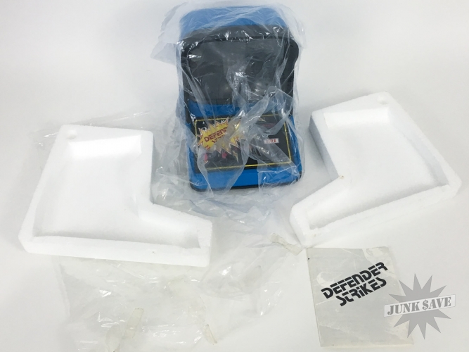 This Defender Strikes is new old stock condition and complete with instructions, 2 styrofoam inserts, a near mint box and even the original plastic baggie (there is an additional bag added so that the original thin plastic bag doesn't get worn). More than 20 years of collecting and have only seen a couple of these pop up in this condition. Box is shiny and clean no smells or moisture damage, just has very minor wear on the corners and surfaces. BTW the art is the same on both sides.