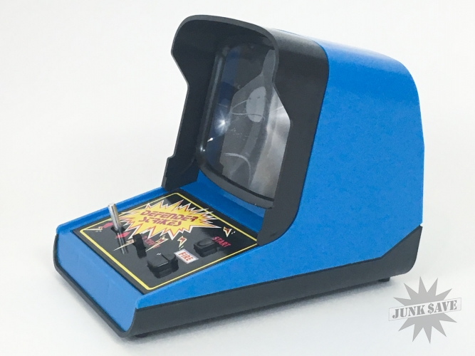 Feast your eyes on this Defender Strikes tabletop electronic game because its majorly rare and not often seen in this condition. The game is unbranded and released by an unknown company (from Hong Kong) and while the game plays like a Galaxian clone its hardware design is reminiscent of 1970s computer terminals. Possibly one the most beautiful vintage tabletop game cases with the deep blue and black trim, a cheesy magnified space background, and great illustrations on the control panel. The joystick is metal and of high quality like the Entex tabletops. Screen is bright and sounds loud, controls are crisp except sometimes you need to repeat the on/off switch to strike the contact. There is loose chunk of plastic inside (sounds smaller than a match head), but the game doesn't appear to be easy to open from bottom - no screws? We have never dared to open it!