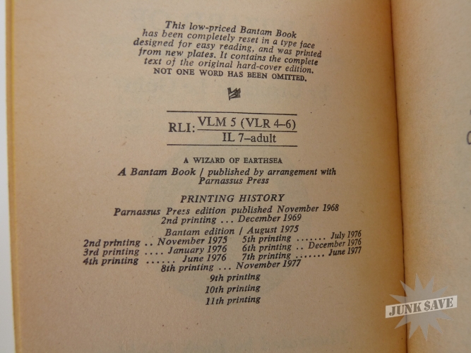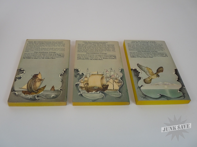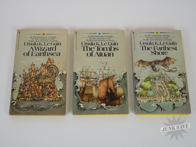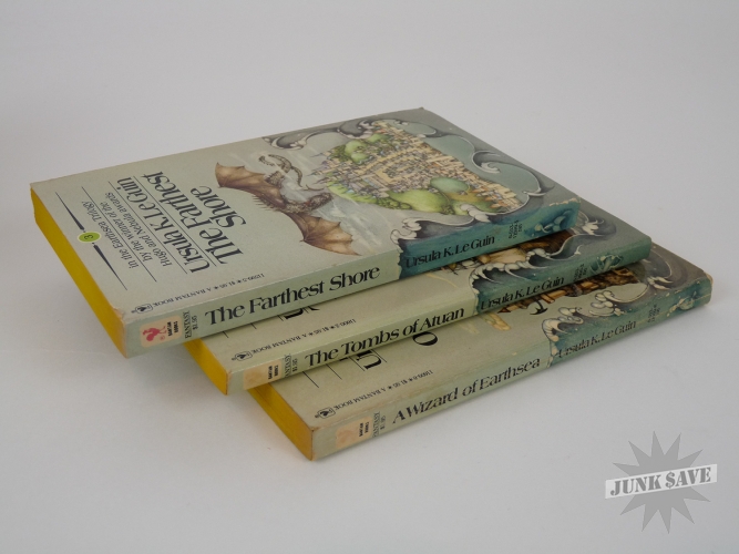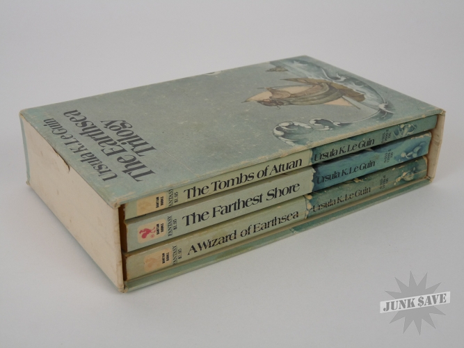 The Hearthsea Trilogy by Ursula K. LeGuin in original slipcase. Bantam paperbacks with $1.95 price, 10th and 11th printings. Book 1 appears to have been read and is in very good condition with light cracks in the spine, however Books 2 and 3 do not appear to have been read and are new yet with tiny corner bumps from the slipcase. Some corner and edge wear to slipcase, no tears or splits, book spines have some sunning but the rest is good. Overall an original clean copy of this influential fantasy series done by a master of the genre.