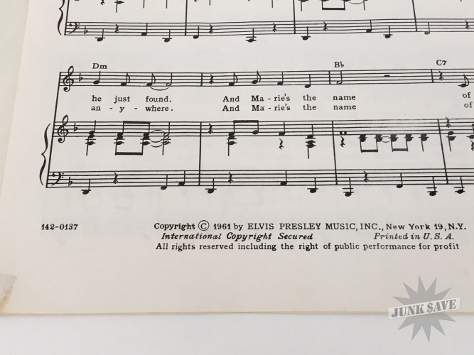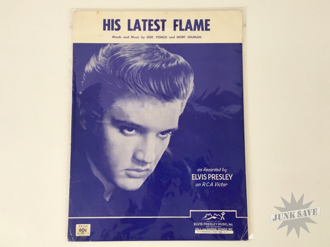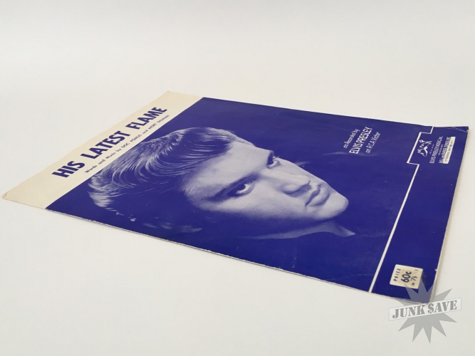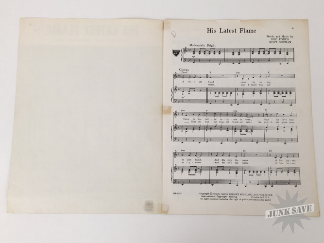 Vintage original sheet music from 1961 for Elvis Presley "His Latest Flame" song. In good condition but has some wear, creased corners, small edge tears, the key "D" written on first page, evidence of scotch tape was used in the past since removed. Please see photos for condition. A hard to find Elvis music sheet.