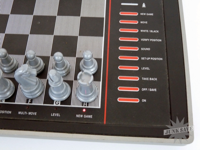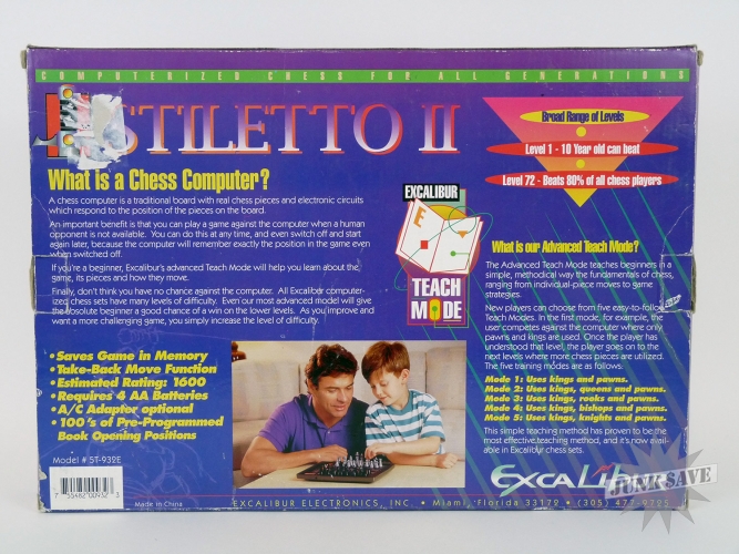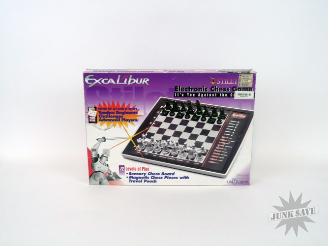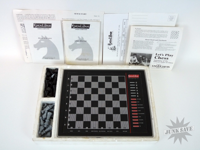 Nice electronic chess set by Excalibur, the Stiletto 2 still in the box with all the magnetic pieces, and their magnets. Doesn't look like it got much use. Tested with batteries (not included) and working good. 72 levels of play, saves game in memory, take-back move function, estimated rating 1600. Box says it is supposed to come with travel pouch but that seems to be gone, but otherwise this seems to have everything else, instructions in English and French and other paperwork.