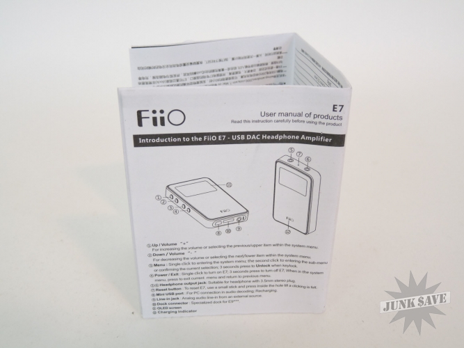 FiiO model E7 portable headphone amplifier USB DAC. In barely used condition and tested working great, with original rubbery case and instruction manual. Very high quality portable DAC with a nice metal chassis and colored screen, great portable sound quality for a bargain price. Please check the web for reviews and specs to determine if this audio gadget fits your needs.