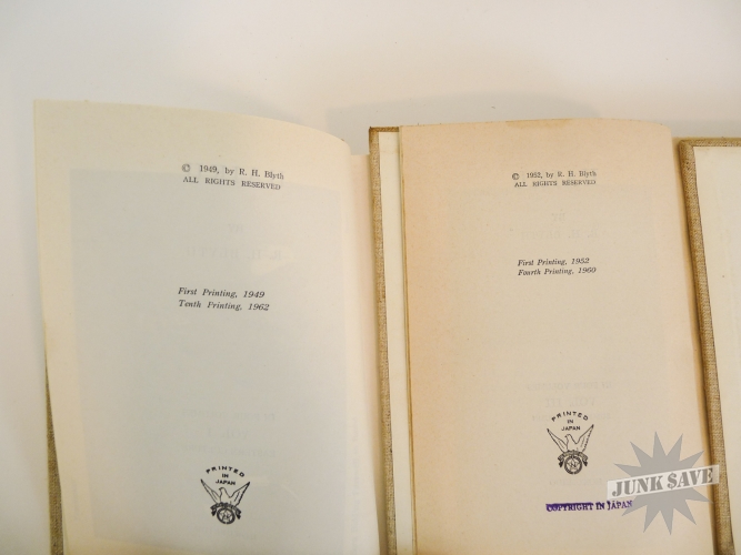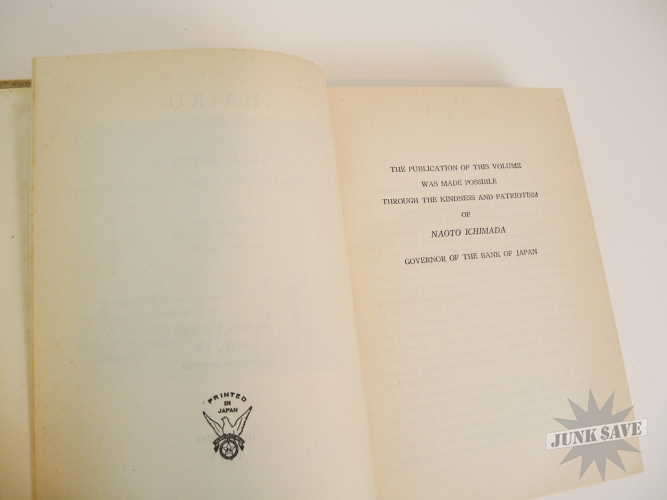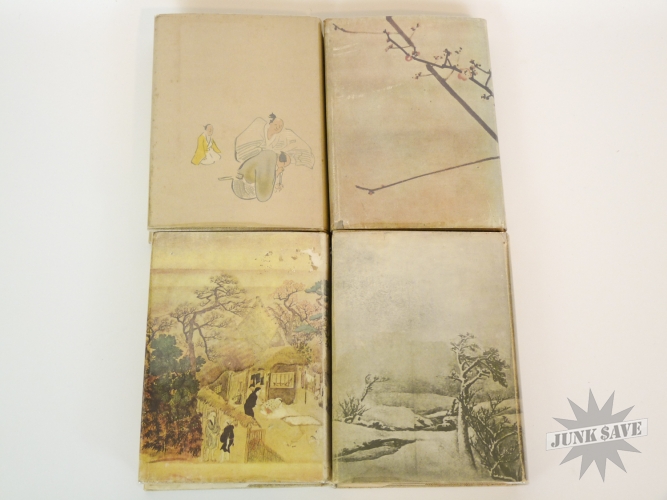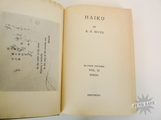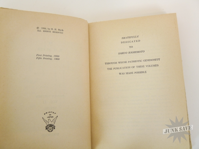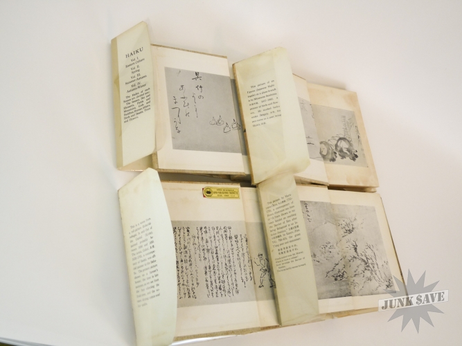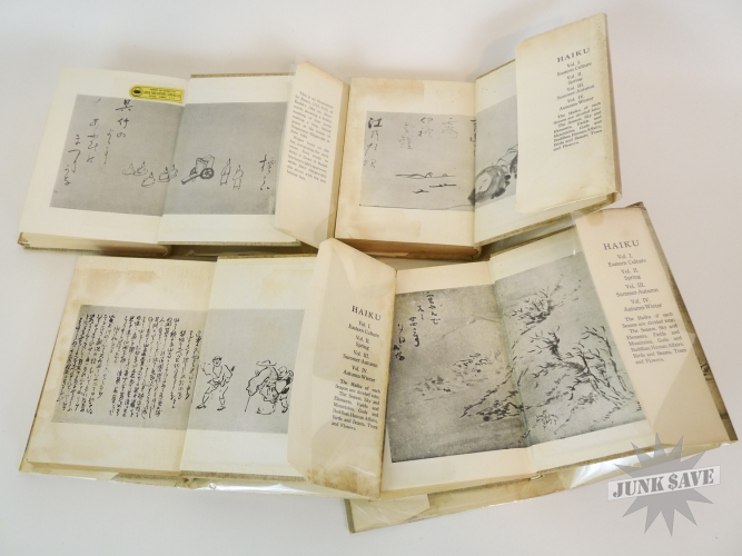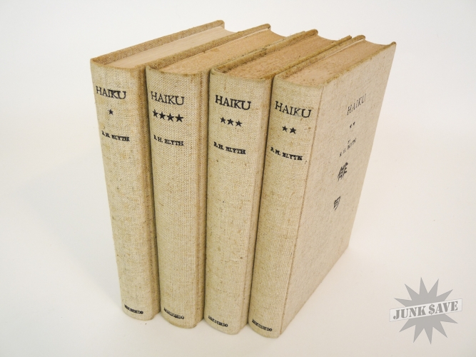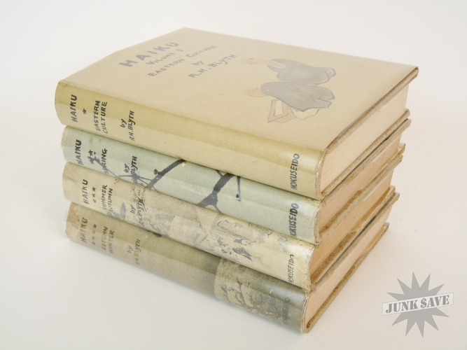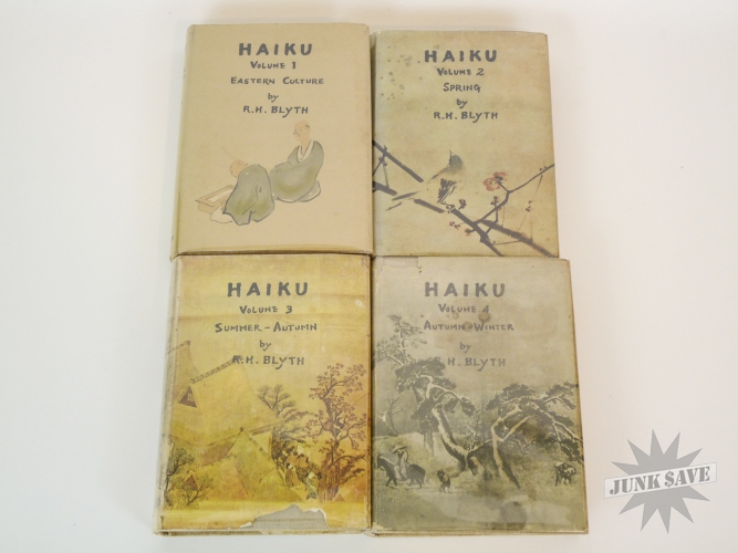 A complete 4 volume set of 1st edition cloth hardcover Haiku by RH Blyth. Eastern Culture, Spring, Summer-Autumn, Autumn-Winter. In very good, approaching near fine condition, good smell, square shape, no water damage, no writing, you can see the one gold label sticker in photo with "Imported and Distrubited by Japan Publications Trading Co", besides that there is some paper foxing common from age. The 4 dust jackets are chipped and missing chunks but in good overall condition, some erased pencil dealer prices on inside flaps, one has a little moisture staining, and they are price-clipped. Two of the volumes state later printing numbers from the early 1960s, but the other two do not state the printing so these two are likely the first printings from the 1950s. Rare to find this very nice vintage set of all 4 Haiku books.