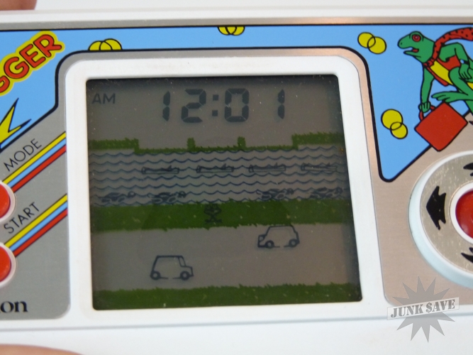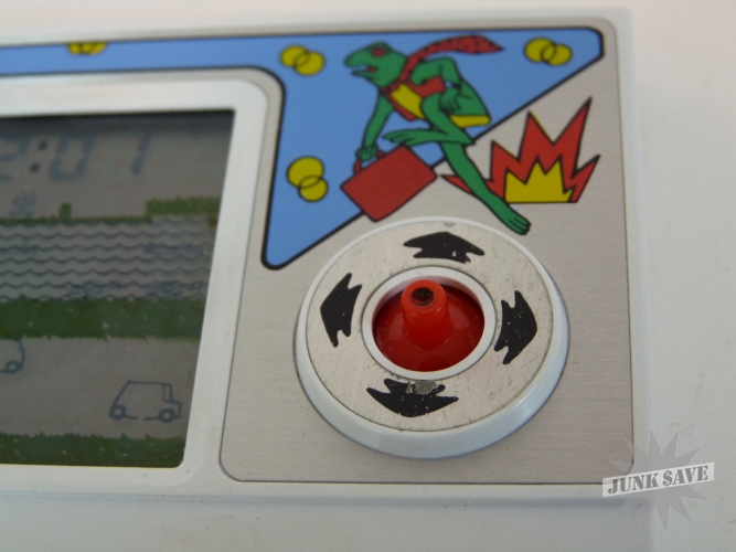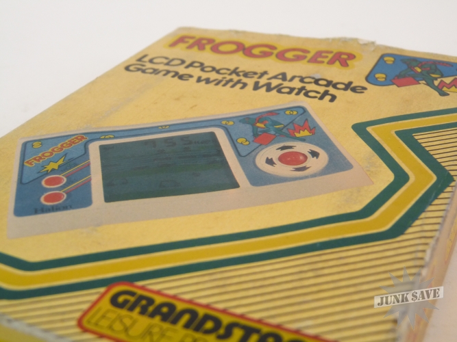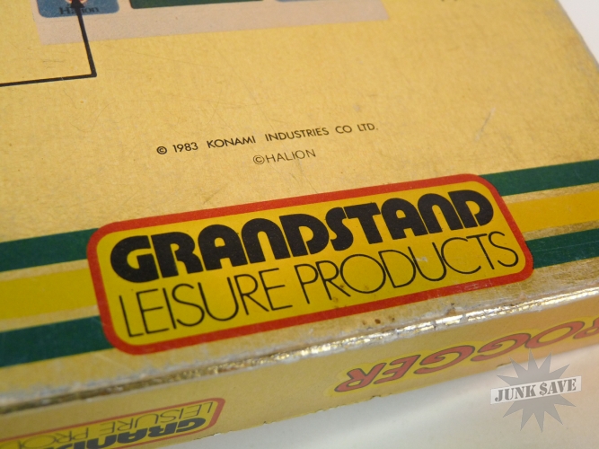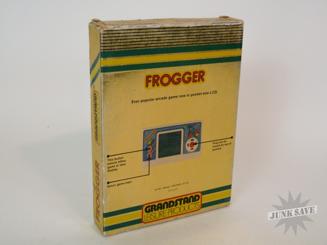 Insanely rare, almost unheard of, wonderful little Frogger LCD electronic game by Halion, made even more obscenely rare by being released under the Grandstand label in their typical foil box design (gold not silver foil)! Only 1 other boxed copy is known to exist in collector hands. That makes this probably the most rare and difficult to find of any Frogger video game. Most likely what happened is the Frogger license was revoked shortly after its release and then pulled from store shelves. Game works great, sound, screen, and controls are all good. The screen has an area in the middle that looks oily in the center from certain angles, but doesn't look bad when looking at screen directly when playing. The game has been used a fair amount and thus has some wear to the bottom and near some of the controls. Comes with original styrofoam holder, instructions manual, and the box. Box has some wear to the edges and such - overall this game is not mint but considering the rarity this is a fabulous item to find.
