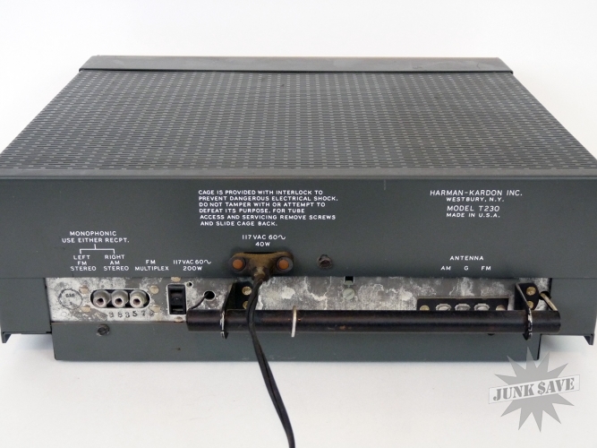 Very rare late 1950s model Harmon Kardon amplifier receiver, the Sonnet model T230 with a beautiful copper interface design. Made in Westbury NY, this is one of their earliest products. The radio is working and it looks like it was well taken care of, and the 2 lights (left and right side) on the display are still even working. We only tested the AM radio as the FM radio requires an external antenna (the AM radio requires antenna too but the old trick of touching the connection with your finger causes the stations to come in!), please be advised this is a very fragile vintage piece of electronics hardware so it may stop working at any time, this item is recommended only for those who know how to tinker and fix these. Excellent condition top to bottom, really looks like a museum piece.