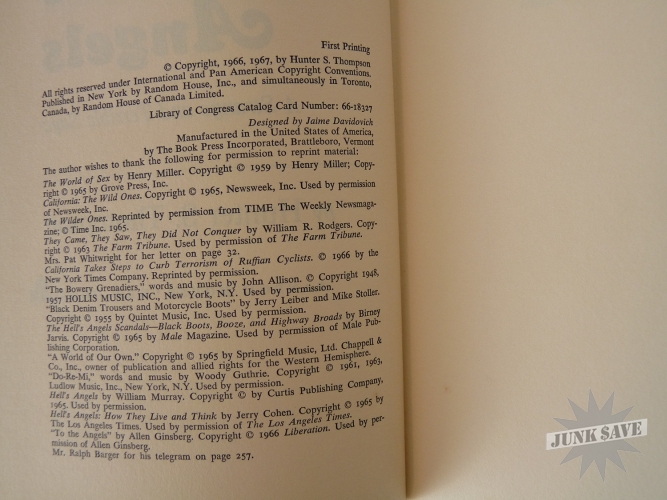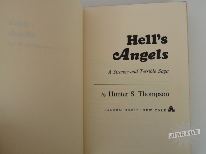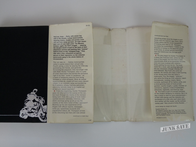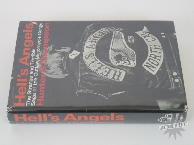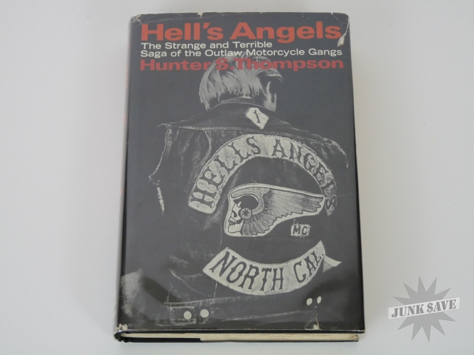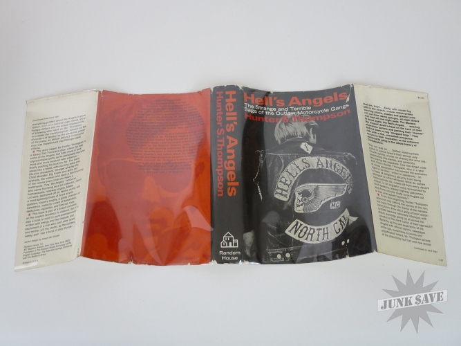 Original first edition first printing hardcover of the fabulous book Hell's Angels, The Strange and Terrible Saga of the Outlaw Motorcycle Gangs by Hunter S. Thompson, a scarce collectible book in very good condition with original dust jacket. Random House New York, 1967. Black cloth hardcover with top edge of pages black, dust jacket showing $4.95 price and 1/67, dust jacket is chipped and wrinkled and a couple 1 inch edge tears otherwise nice. Stated first printing on the copyright page. Spine slightly skewed, and some wear to the page edges as shown in photo. NO writing, NO ex-library, NO book plate, NO dealer markings (erased or otherwise), this is a solid estate-fresh VG copy.