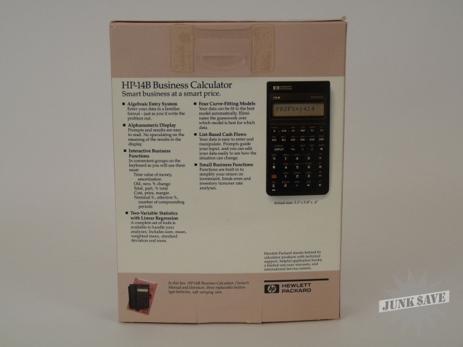 Great financial calculator, the Hewlett Packard HP-14B. This is not the 50th Anniversary version, just the regular version. New in box never used. A classic 1980s model, highly functional and great quality. Box includes a large user manual. Very tough to find in this condition.