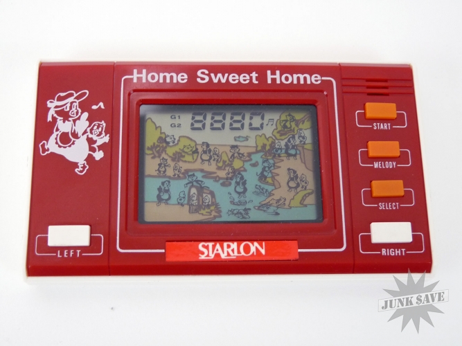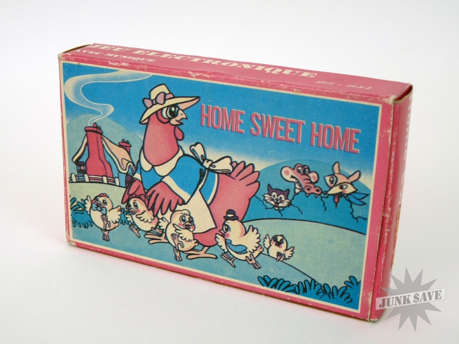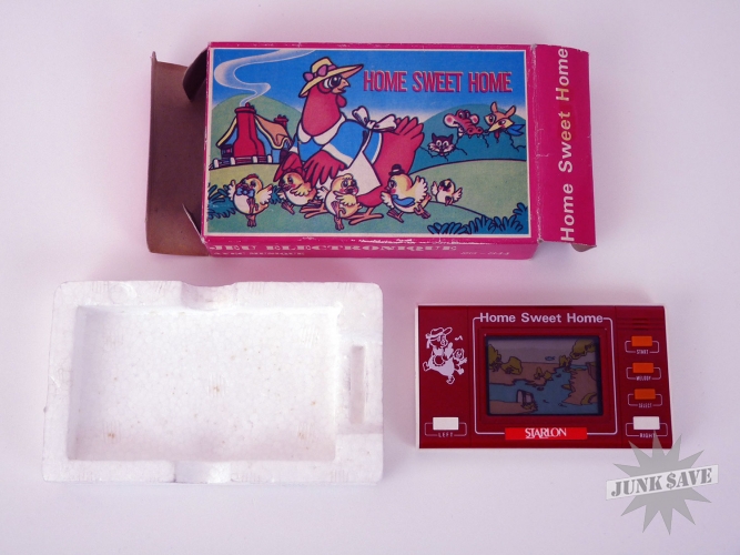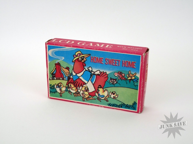 Vintage Home Sweet Home LCD handheld video game from the early 1980s. Usually seen released under the Sunwing label, this one is by Starlon. Very rare and bizarre game about a mama chicken and her chicks being hunted by hungry animals, tough to find mint in box like this one. Does not have instruction manual. Game appears to have been little used.