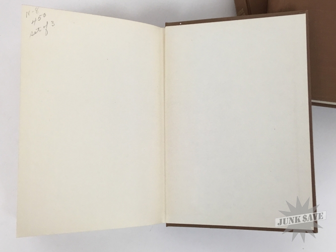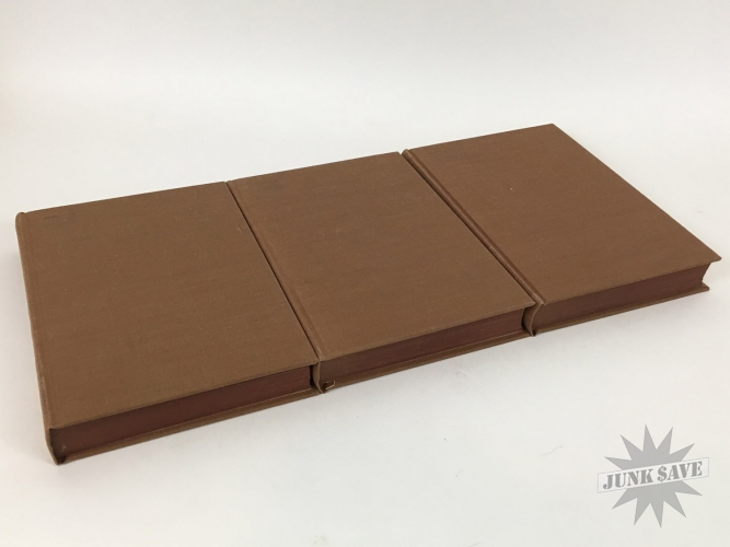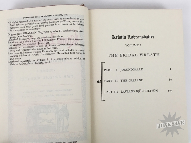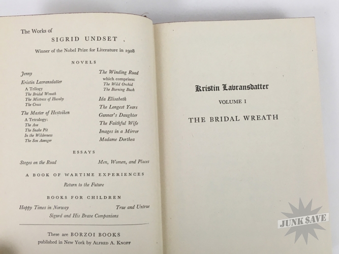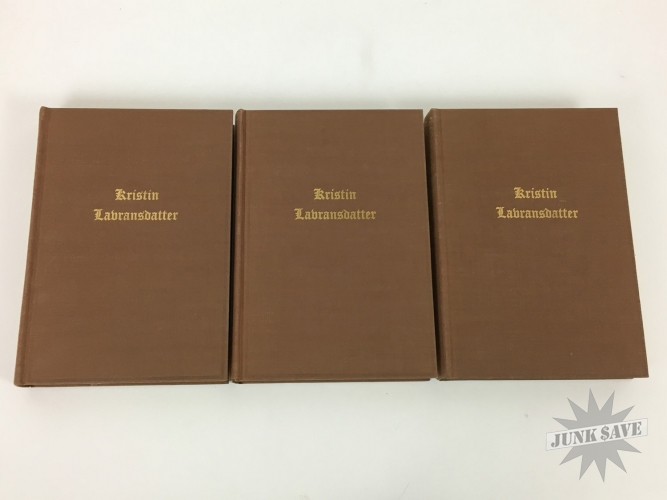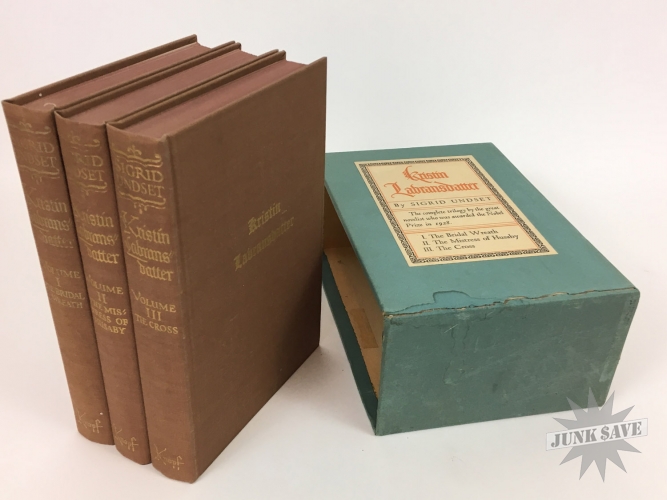 The amazing "Kristen Lavransdatter" Norwegian Trilogy by Sigrid Undset, english translated hardcover box-set edition with slipcase from 1946. Contains three books The Bridal Wreath, The Mistress of Husaby, and The Cross - books themselves are near fine condition like they've hardly been read being protected by slipcase, although previous owner did write their name and date on the pasted-down front page. Slipcase also very nice for its age, the only issues it has some moisture staining and small tear forming at the bottom.