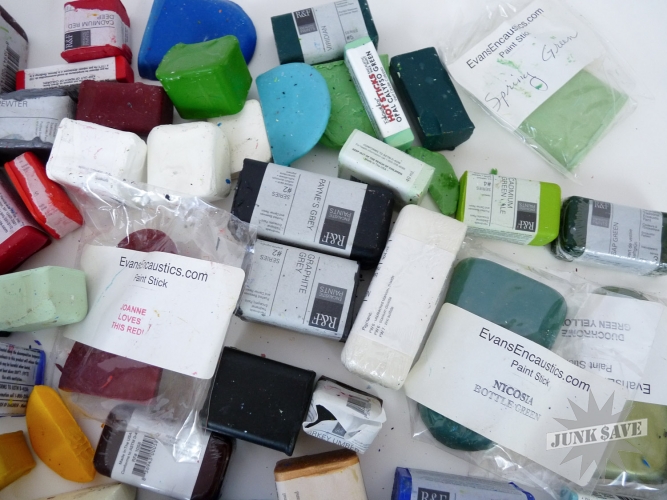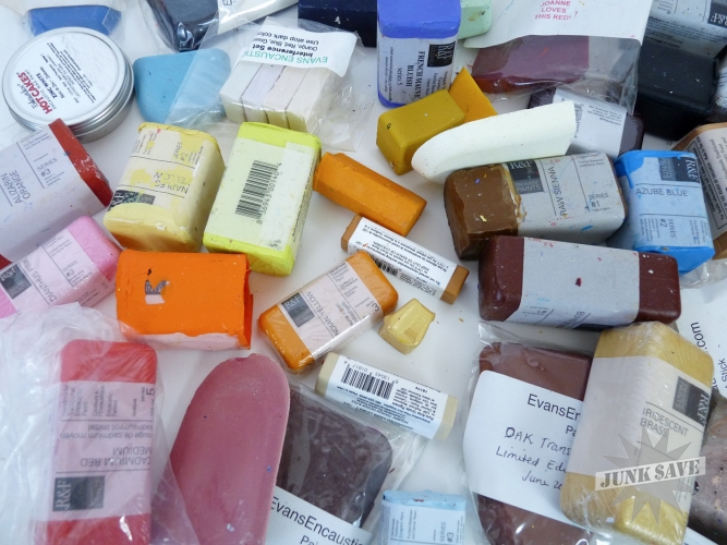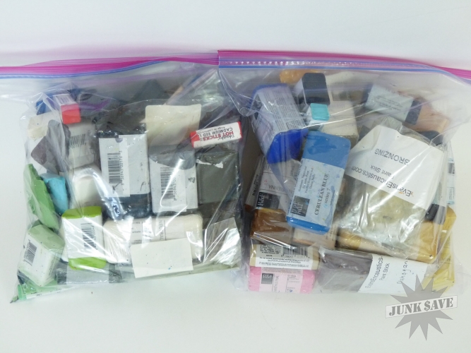Lot of 2 gallon-sized plastic bags FULL of encaustic paint bars. Some have been opened and used, some have not. Great color selection, great quality. Looks like at least 75 different bars here. Evans Encaustics, R&F, etc please check the photos. Estate fresh lot, get 'em while they're hot. Your easel and canvas are calling...