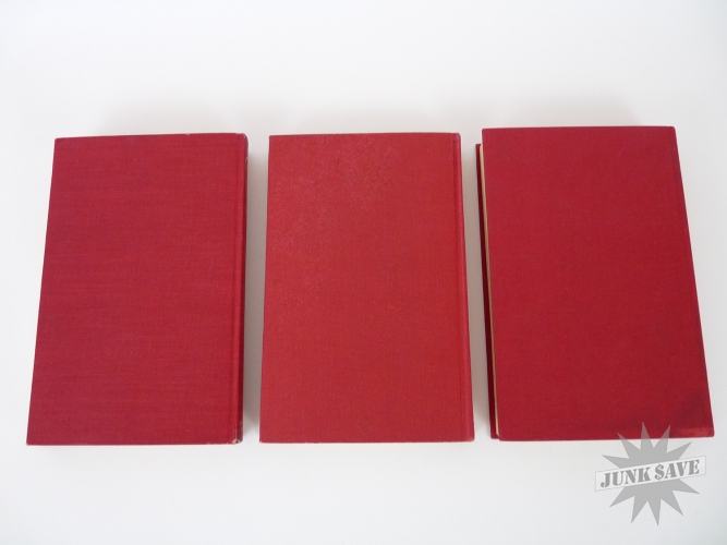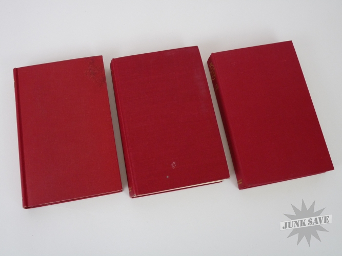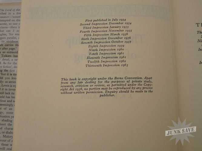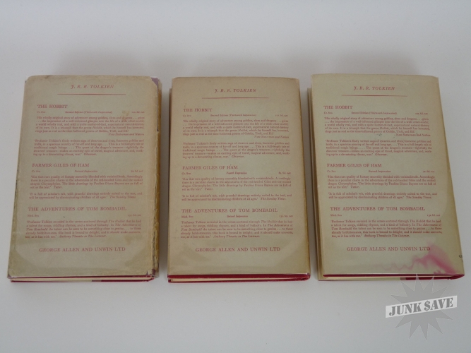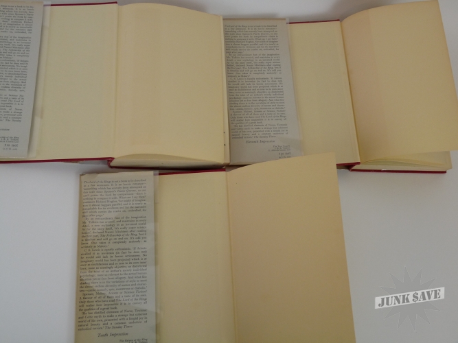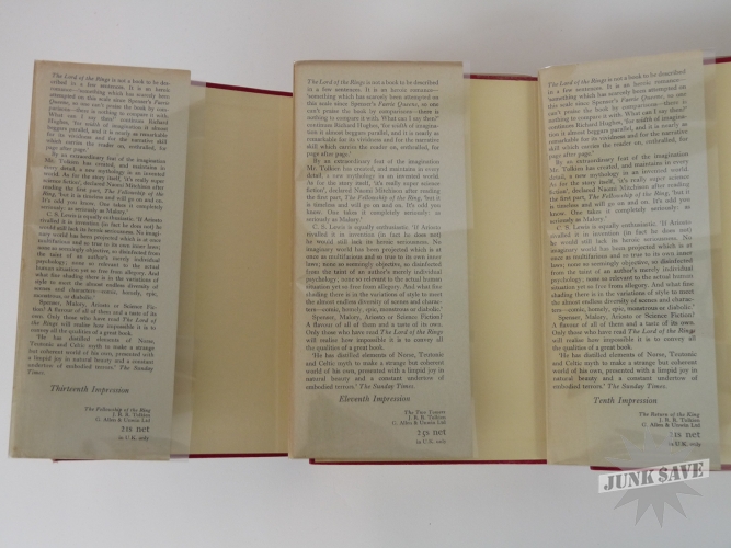 Red cloth boards and original dust jackets are all in very good condition. Minor issues include some spine skewing (mostly with Fellowship), bumped corners, edge wear or light stains. And dust jackets have foxing or sunning, small chips or tears, the usual wear seen on these fragile but amazing jackets. On the plus side all maps are present in each book, the books do not have any writings or dealer markings that I could find, no bookplates, no ex-library, and the cloth boards are generally clean and binding good. So these could be read a few more times without much harm, and are also nicely matched for display. Don't be a Balrog - buy this collector's set today!