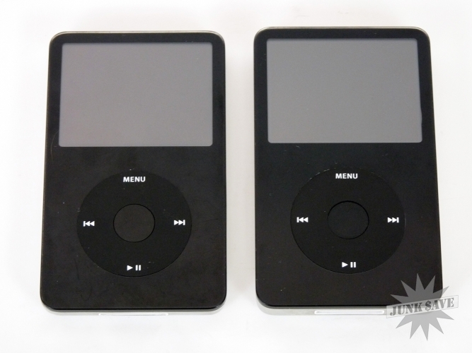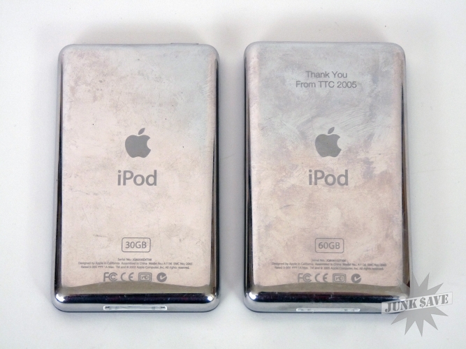 Lot of 2 Apple iPod Classic 5th generation music players from 2005. Both are black, model A1136 iPods. One is working and one is not working. The 30GB model isn't booting up, makes the dreaded hard drive sound when charging but the screen seems OK with apple logo and charging message. Luckily the 60GB is working great and is loaded up with good music. Both are in good cosmetic condition, with normal surface wear and light scratches from use, control pads good and screens good, no cracks or dents on these. The working 60GB model has custom engraving on the bottom saying "Thank you from TTC 2005". Selling only 2 iPods, no headphones or charging cables, and remember that the smaller iPod isn't working!