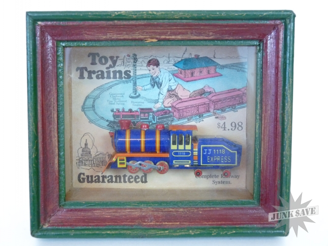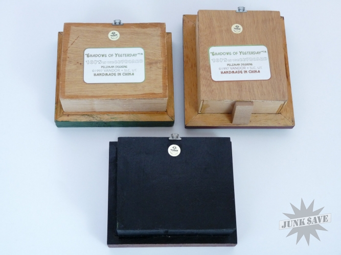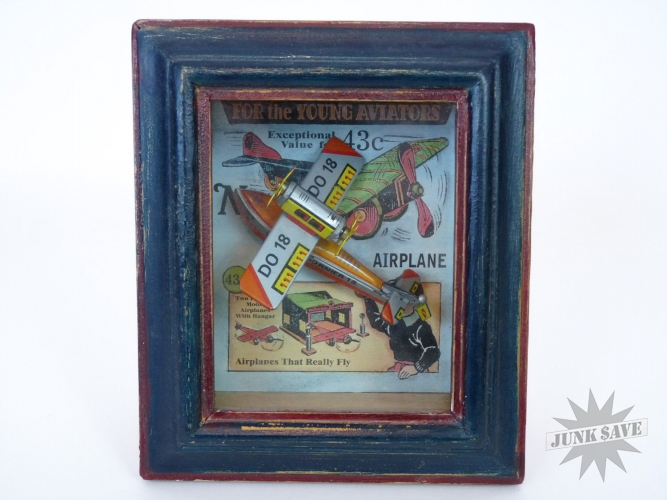 Lot of 3 different framed tin toys, very unique and sentimental items, these are antique reproductions made in the late 1990s by Vandor. "Shadows of Yesterday" "Toys in the Cupboard" series. Airplane, Train, and an amazing Monkey Motorcycle. All are in excellent condition, the glass not cracked and the toys are glued securely inside. The frames are also good, however you can see from photos some of the wood is starting to warp a bit in the back. Frames are painted and have wear to them which is part of the design, done on purpose. Great display pieces and have hangers attached on the top.
