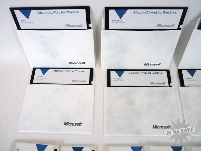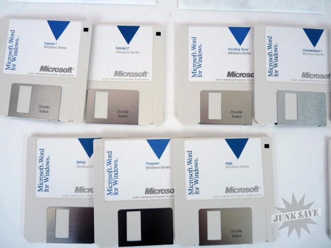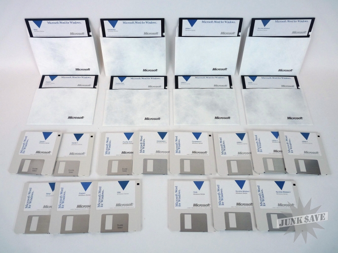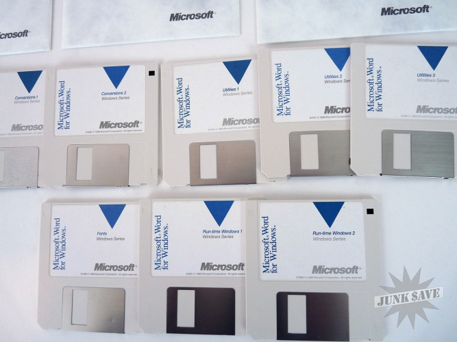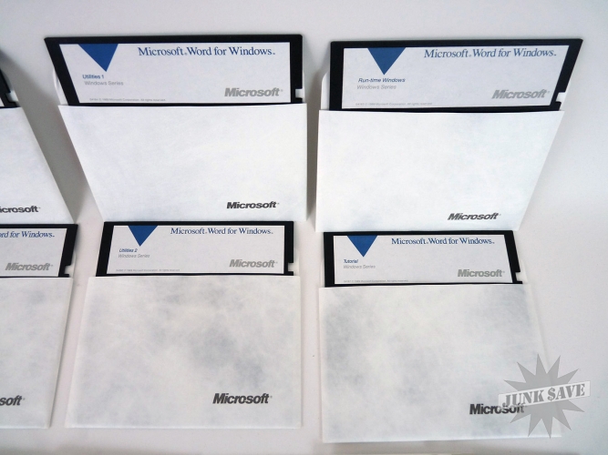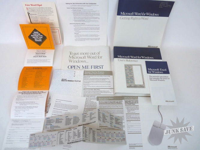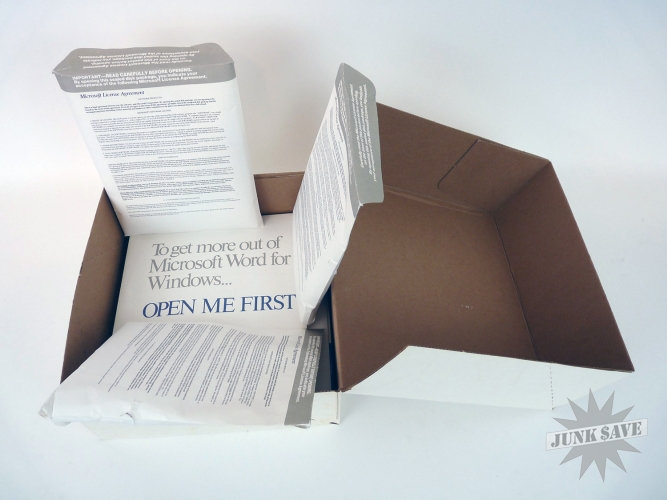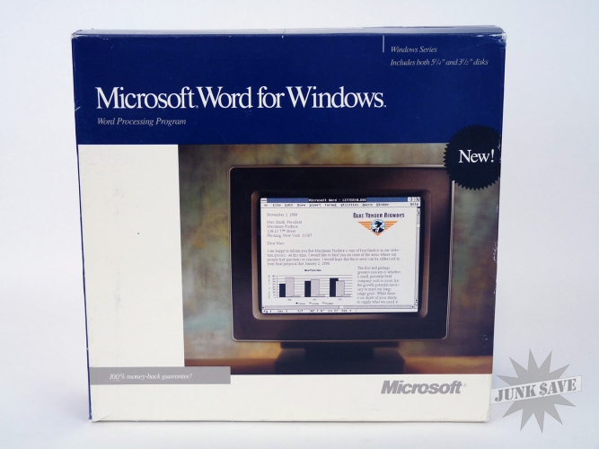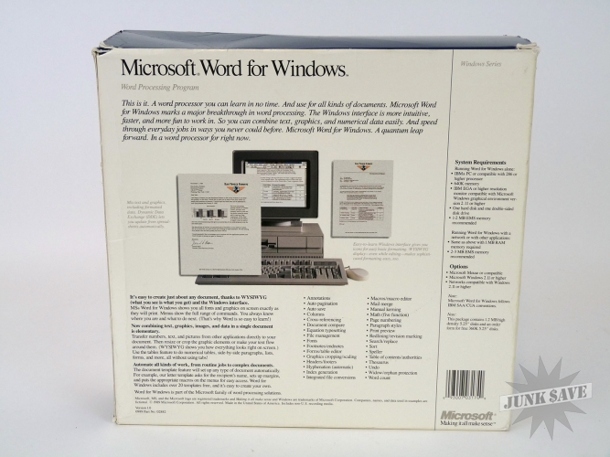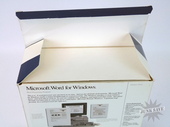 Microsoft Word for Windows - very rare original version 1.0 from September 1989! Whoever originally purchased it carefully opened the box and disk envelopes, then probably backed up the disks, and then closed the box and forgot about it. Box marked "Distribution for USA only, Version 1.0, 0989, Part No 02882". Compatible with Windows 2.11 or higher :) Being sold today for significantly less than the original selling price of $495. This software is the masterpiece of programmer Charles Simonyi. Comes with both 5.25 and 3.5 inch disks. I am unable to test the disks. Also included are the hardcover and softcover books, paperwork and unused keyboard overlays - all of it in nearly untouched condition. Even the box doesn't have any tears or typical issues, just some wear to the corners and a little wrinkling to the top flap.