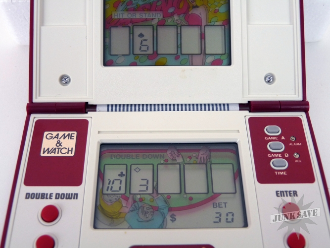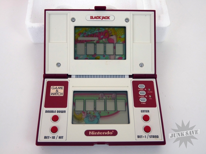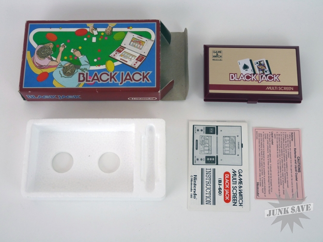 Nintendo collectible Game & Watch Blackjack double-screen LCD. In exceptional condition with box, styrofoam, instructions, and pink sheet. Tough to find in this condition.