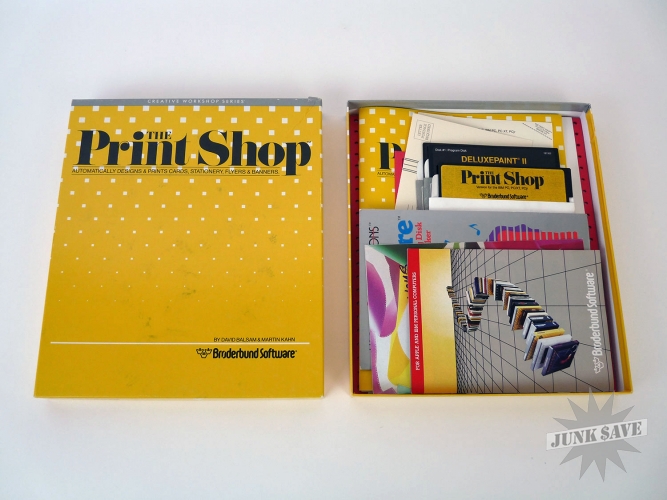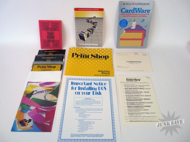 The original "Print Shop" software package by Broderbund released in 1985. Very rare to find this early version in this condition, with box, disks, and all paperwork. Deluxe Paint II software is also included, and there is even some red dot matrix paper included in the box (not shown in photos). For IBM PC compatibles with DOS 2.0 and higher. Time to make some long dot matrix banners!