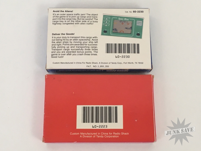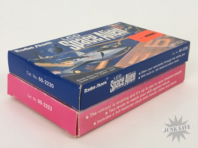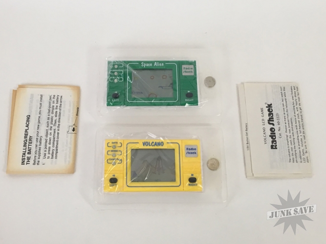 Lot of 2 new old stock Radio Shack LCD video games - Space Alien and Volcano. Both are complete and in unused condition. Box have orange price stickers on the front from "Jims Gun Shop" LOL. Games in this series are also seen from other brands labeled as "Mini-Arcade". Space Alien is fairly common, with Volcano being more rare.