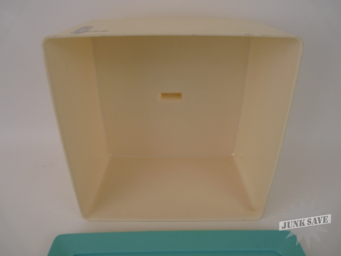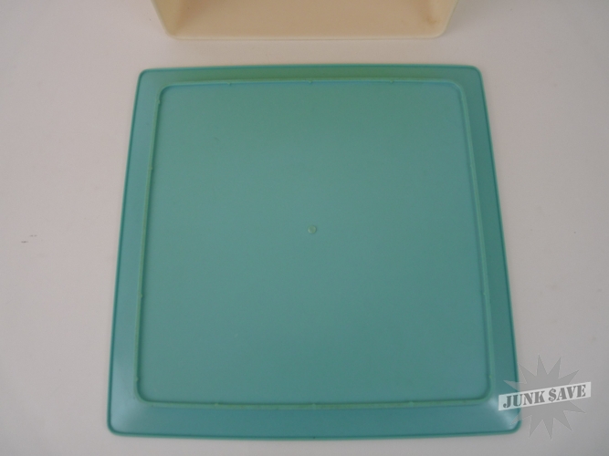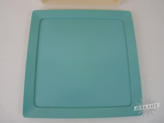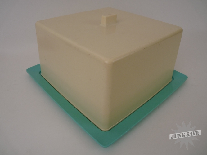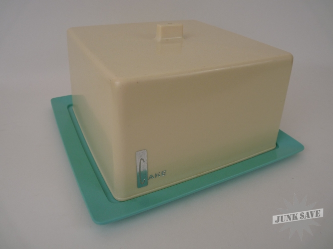 Turquoise blue and creamy white cake platter with lid from the 1950s in immaculate condition for its age. Made of plastic, it has no cracks, chips, discoloration or soiling of any kind, just normal surface wear, looks almost new and ready for cakes. Rarely seen item, a fine retro space age mid-century modern piece.