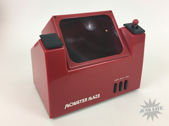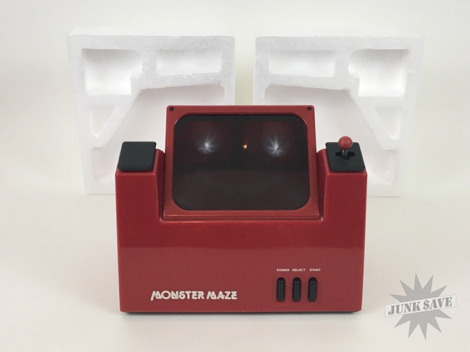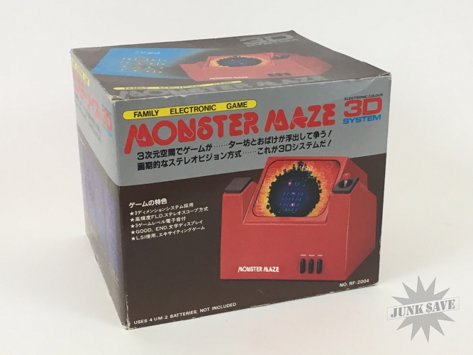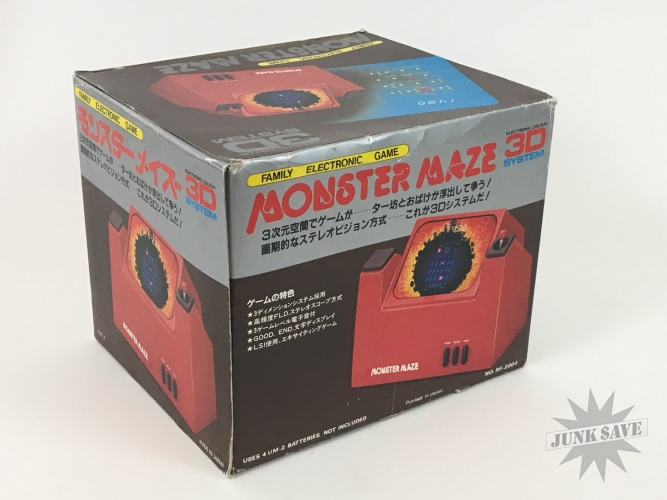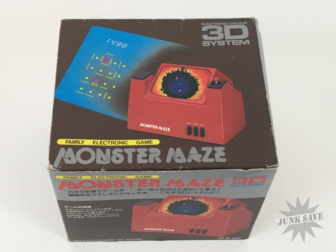 An insanely rare new old stock tabletop video game called Monster Maze! Its a 3-D vacuum florescent color screen type sold by "JIM" from Japan. Typically this game is seen as "Puck n Monster" sold under the brand name "Rosy", we have never seen this Japanese version and doubt any game collectors have one anywhere near this condition. Game plays like Pac-Man of course and was tested the game works perfectly. Stunning condition hardly ever used, found from old dealer stock (only 1 was found) just some very minor wear to box edges and corners, a few small creases/dents please see photos. Box still has very nice styrofoams, original plastic baggie, and instructions booklet. Box graphics have strong colors and no price sticker damage. We have dropped the price its now on sale not to be missed if you are into these old retro tabletops.