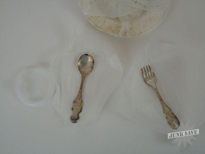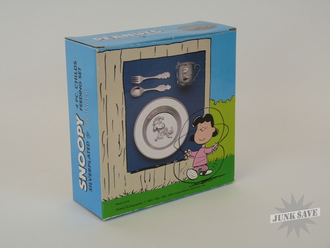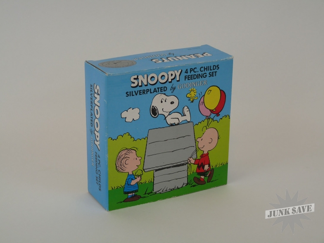 Silver plated Snoopy 4-piece feeding set by Godinger, vintage 1960s new old stock. The silver plated pieces have never been touched since they left the factory nearly 50 years ago, so they have toning in some areas. The silver toning could be easily cleaned off, but I have left everything untouched.