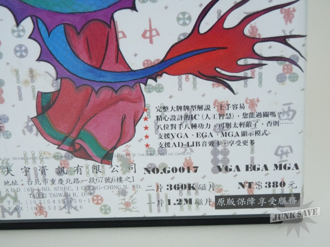 Very rare and minty condition Softstar Taiwan game for vintage IBM PC XT/AT/386 computers, appears to be a Mahjong game. Released in the 1980s game model # is G0017. Plastic box and instructions and 3 floppy disks 360K. Looks like it was never used. Requires DOS 3.x and 360K floppy drive. Package design is fantastic, Softstar is famous for its groundbreaking and high quality adventure games, this is an early release of theirs and quite scarce.