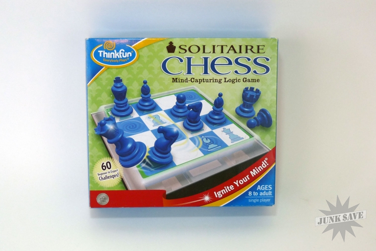 Solitaire Chess game by Thinkfun, gently used and like new in box. Comes with instructions, the puzzle cards, and all the pieces which are stored conveniently in the bottom tray of the game. Challenging combination/tactics puzzles and only 1 player required. Hints and solutions included in the instructions, but if you are a 2000+ rated chess player you won't need them.