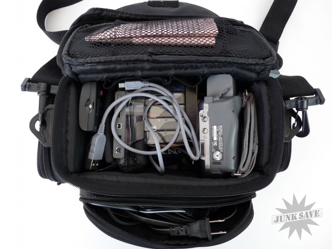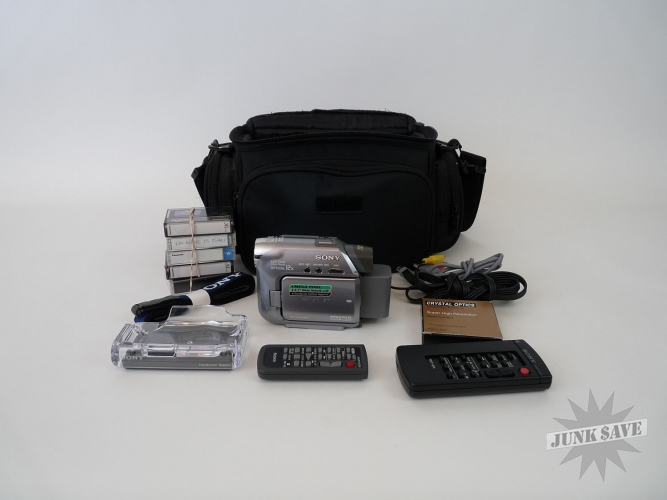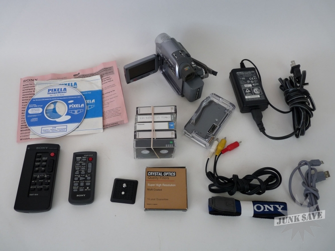 Very nice Sony Handycam with a high quality bag and lots of accessories. The camcorder appears to have been taken care of and appears almost new. Plugged it in and did some testing and all is working. The strap is new, there are some tapes, some with recordings on it, 2 remote controls, a desktop charging stand, A/V cable, USB cable, and power cable. Pixela ImageMixer software CD also there. Very nice minty set, with a high quality camera bag!