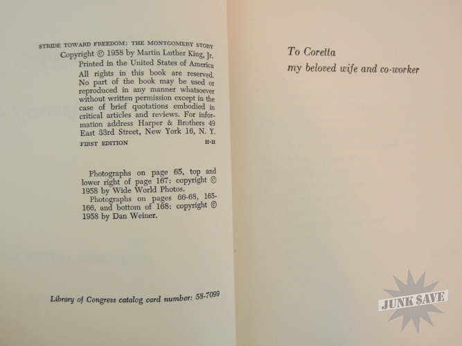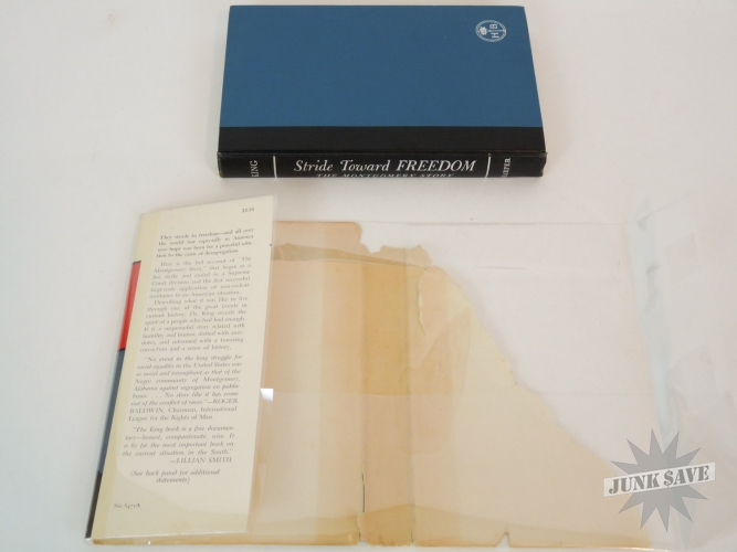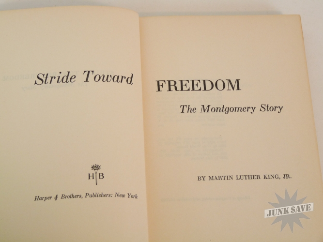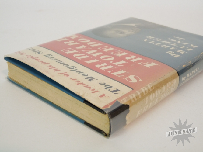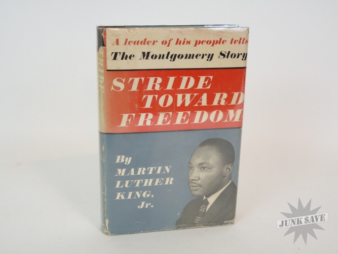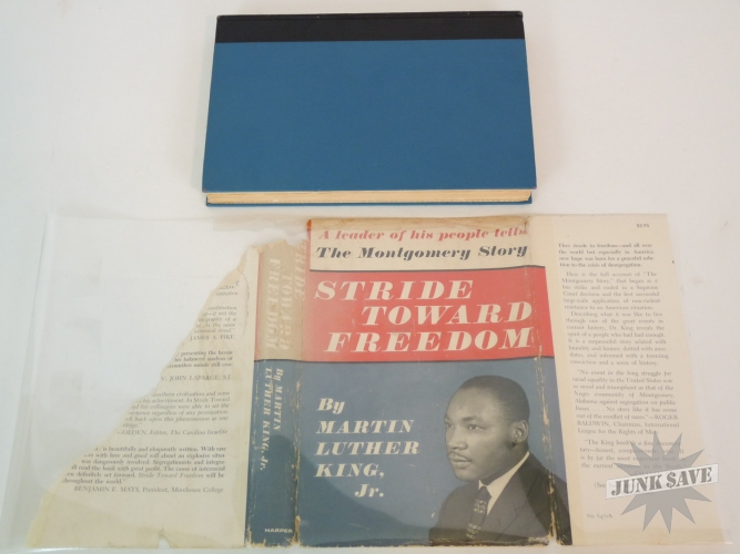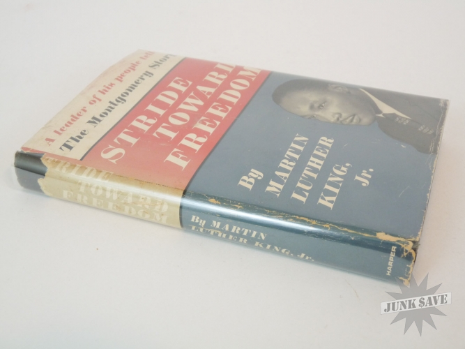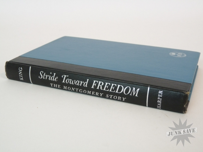 Stride Toward Freedom, The Montgomery Story by Martin Luther King, Jr. Original 1st edition, 1st printing hardcover with partial dust jacket. Copyright page shows "FIRST EDITION H-H" which is the rare 1st printing code. Not an expert on book grading but hardcover looks near fine condition, only writing is " Gertrude H Roberts" in pencil on first page - no dealer markings this is estate fresh! Very square clean copy, not many negatives to report except for the dust jacket is faded (although colors are stronger than depicted in photos) and is obviously not only chipped on the edges and spine but is missing a large area of the backside. Luckily the dust jacket looks great from the front. Beautiful man beautiful book!