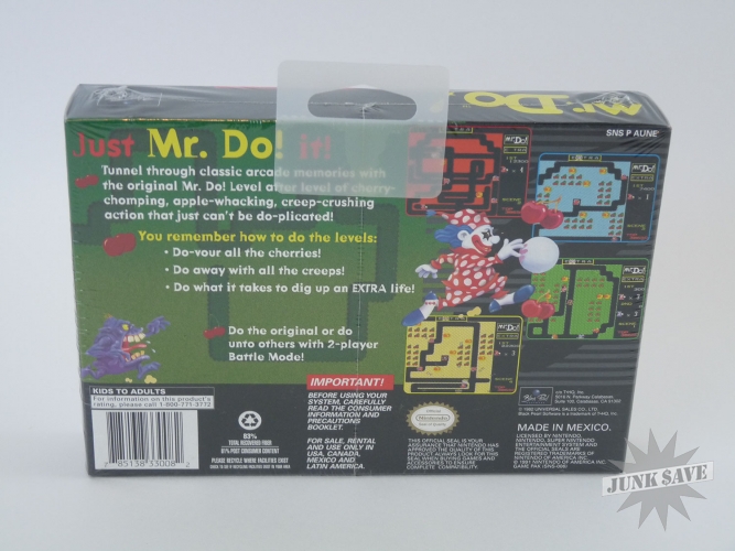 Super Nintendo game cartridge, Mr. Do Arcade Classic. Condition-wise this is as good as it gets - brand new and still shrink-wrapped in a very square, solid box that still has the shelf/hanger piece attached. Stunning!