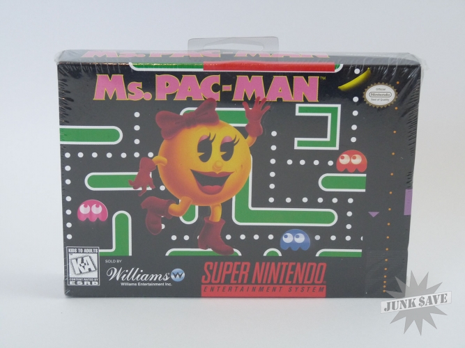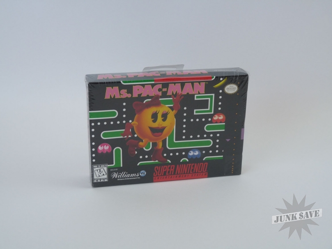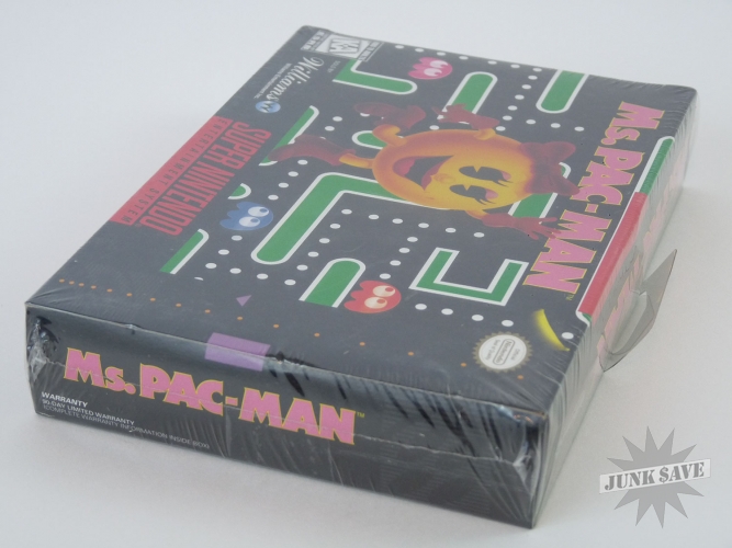 Super Nintendo game cartridge, Ms. Pac-man. Condition-wise this is as good as it gets - brand new and still shrink-wrapped in a very square, solid box that still has the shelf/hanger piece attached. Stunning!