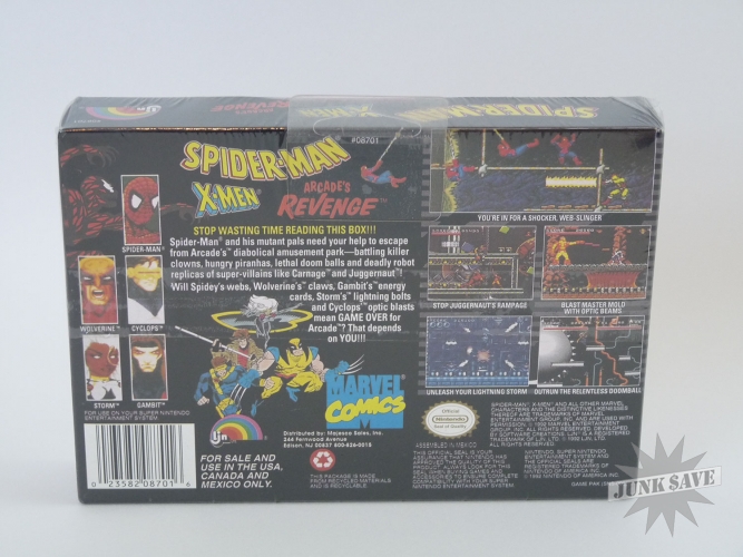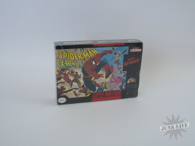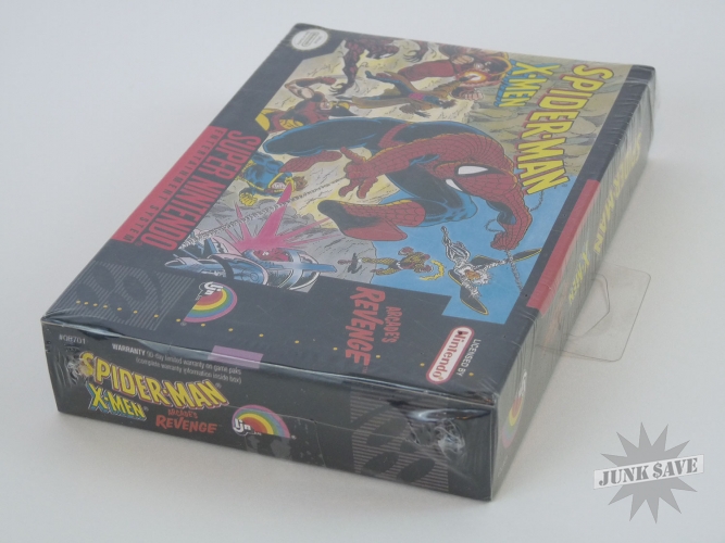 Super Nintendo game cartridge, Spiderman X-Men Arcade's Revenge. Condition-wise this is as good as it gets - brand new and still shrink-wrapped in a very square, solid box that still has the shelf/hanger piece attached. Stunning!