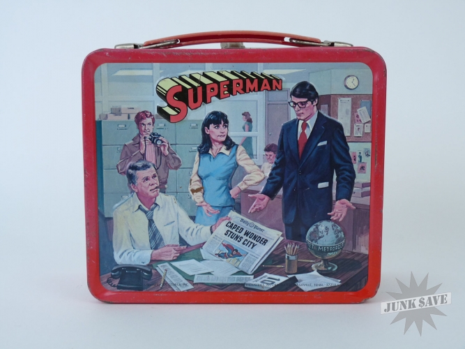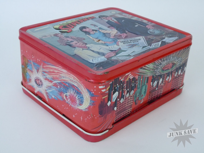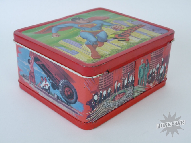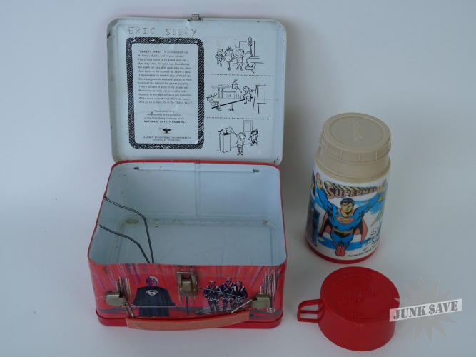 Excellent condition vintage Superman lunchbox from 1978, released after the highly successful original feature film. Still has thermos. Hinge and handle are good. Condition 7 or 8. Very little rust, scratches, or dents. The only major dent/crack is on the top of the front side, just below the latch, not very noticeable but worth mentioning. Also a name was scratched on the inside lid. Beautiful displaying and complete box.