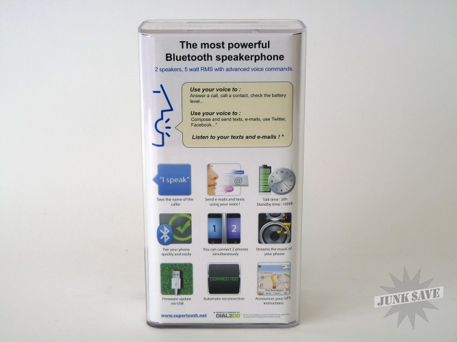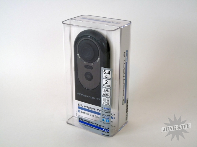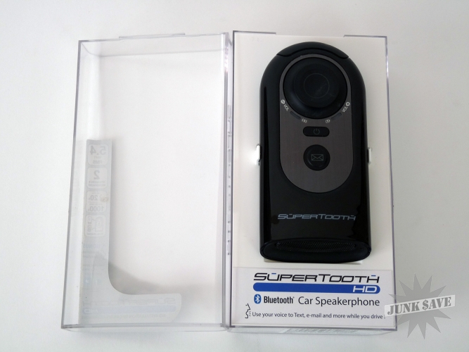 Supertooth HD car speakerphone. Still has box, car charger, cable, and instructions. 2 speakers, 5 watts RMS, voice command activated. Used only a few times, works great.
