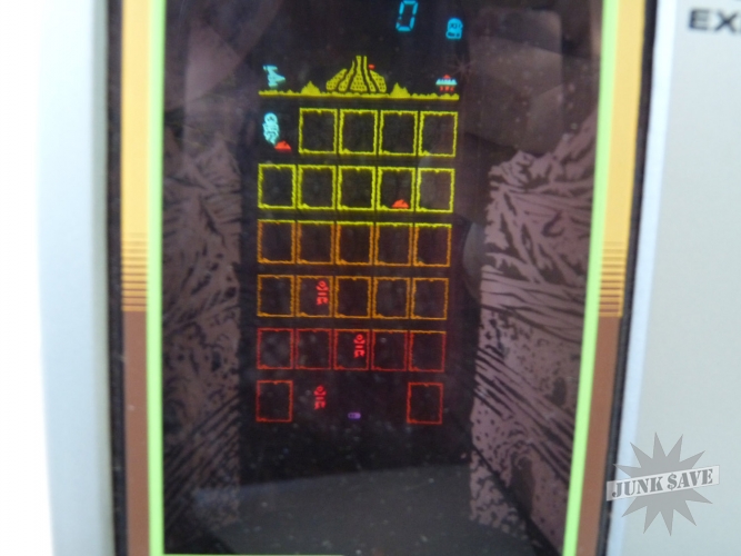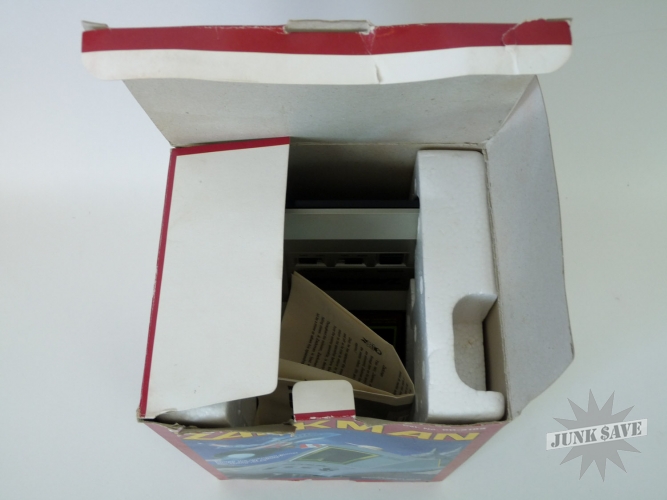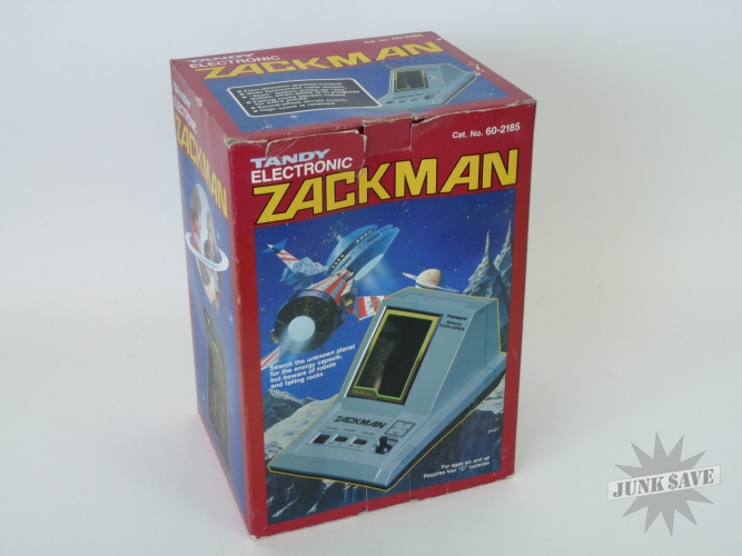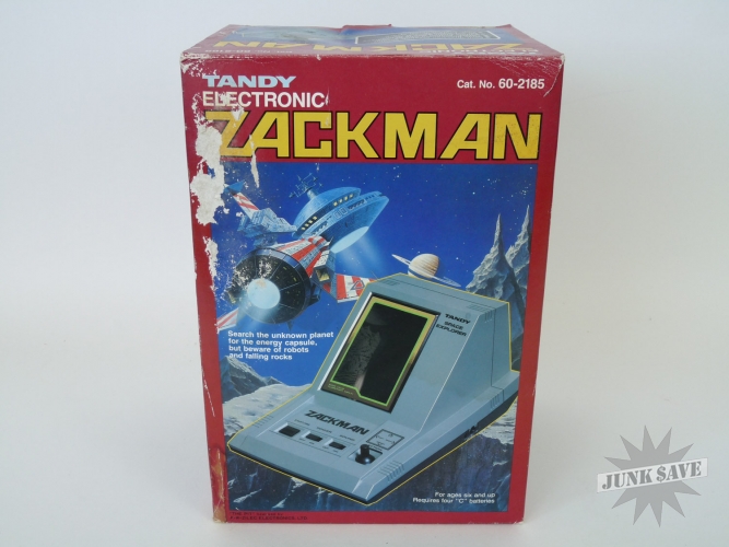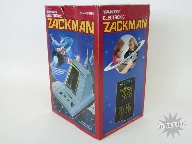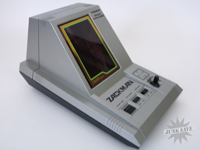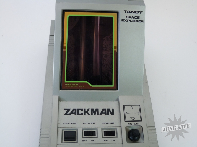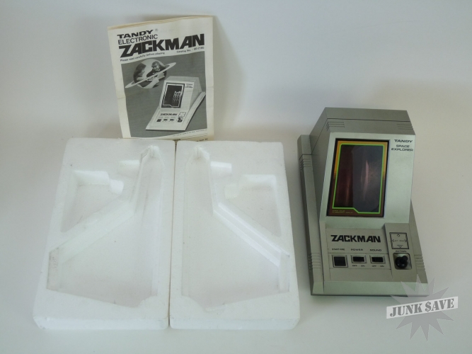Very nice condition Tandy Zackman Space Explorer tabletop VFD game. This game is scarce but not impossible to find, however for some reason this one is very difficult to find complete in a good condition box, and this one is the best we've seen in 20 years of collecting video games. Made by Bandai and released in the US by Tandy Radio Shack. This obscure game is fun to play! Alot like "Dig Dug" and is based on an early stand-up arcade machine called "The Pit" by Centauri. The game is in hardly played, great condition with battery cover and clean battery contacts, screen buttons and graphics are nice just a little dusty from sitting on a shelf. Tested and functions perfectly. Box still has instruction manual and good styrofoam inserts. The box has some damage to one side near the top (luckily front and back box graphics are the same), and wear along the edges and corners, with some minor tears (1 inch or less). Box is sturdy and not "crushed" looking and displays nicely, not perfect, but great considering rarity.
