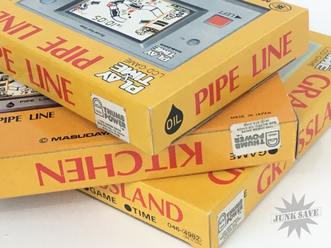 Complete set of 3 yellow boxed "Thumb Power" Masudaya LCD handheld games imported from Japan in 1982. Some interesting gaming history here...