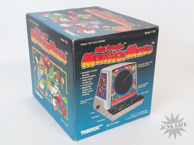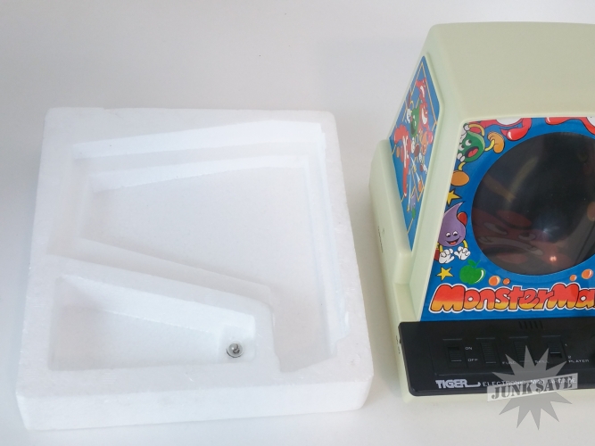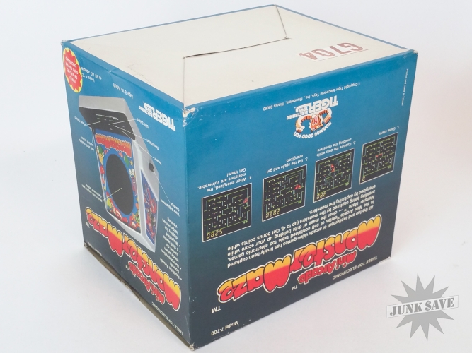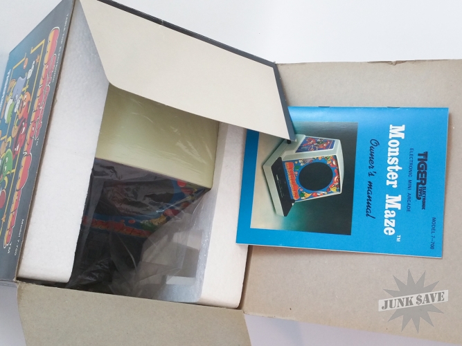 Insanely rare Tiger tabletop video game Monster Maze which is a Pac-Man clone. One of the rarest tabletop video mini-arcades of the 1980s, and this one is unbelievable condition new old stock never used complete with box, instructions, styrofoam inserts, and plastic baggie. These Tiger tabletops are typically not seen with styrofoam inserts since at the factory usually the game was placed loose in the box with some extra cardboard flaps so very unusual to see. Incredible once-in-a-lifetime collector condition!
